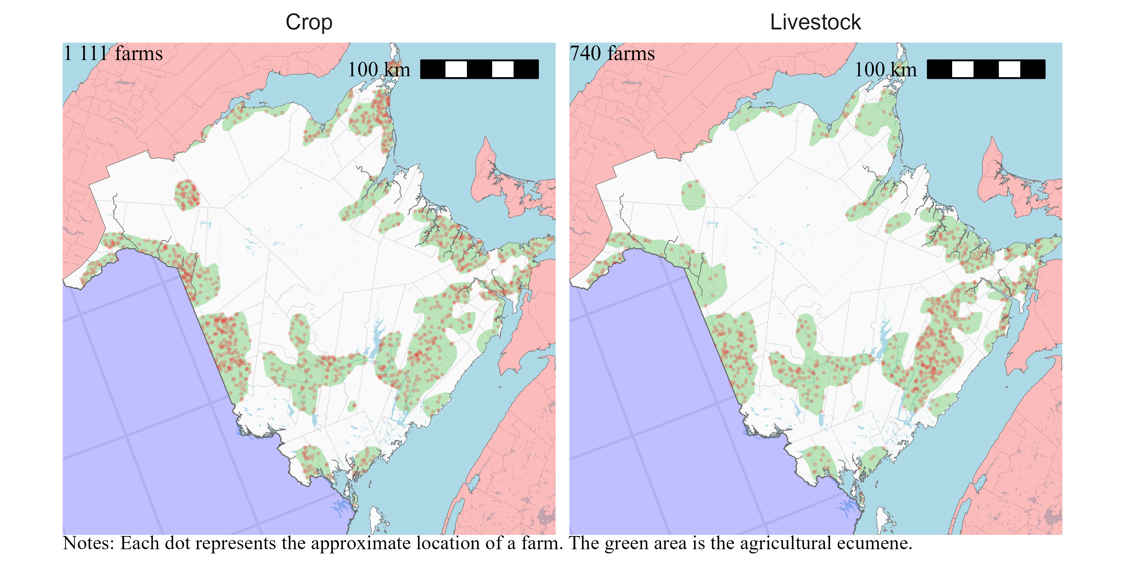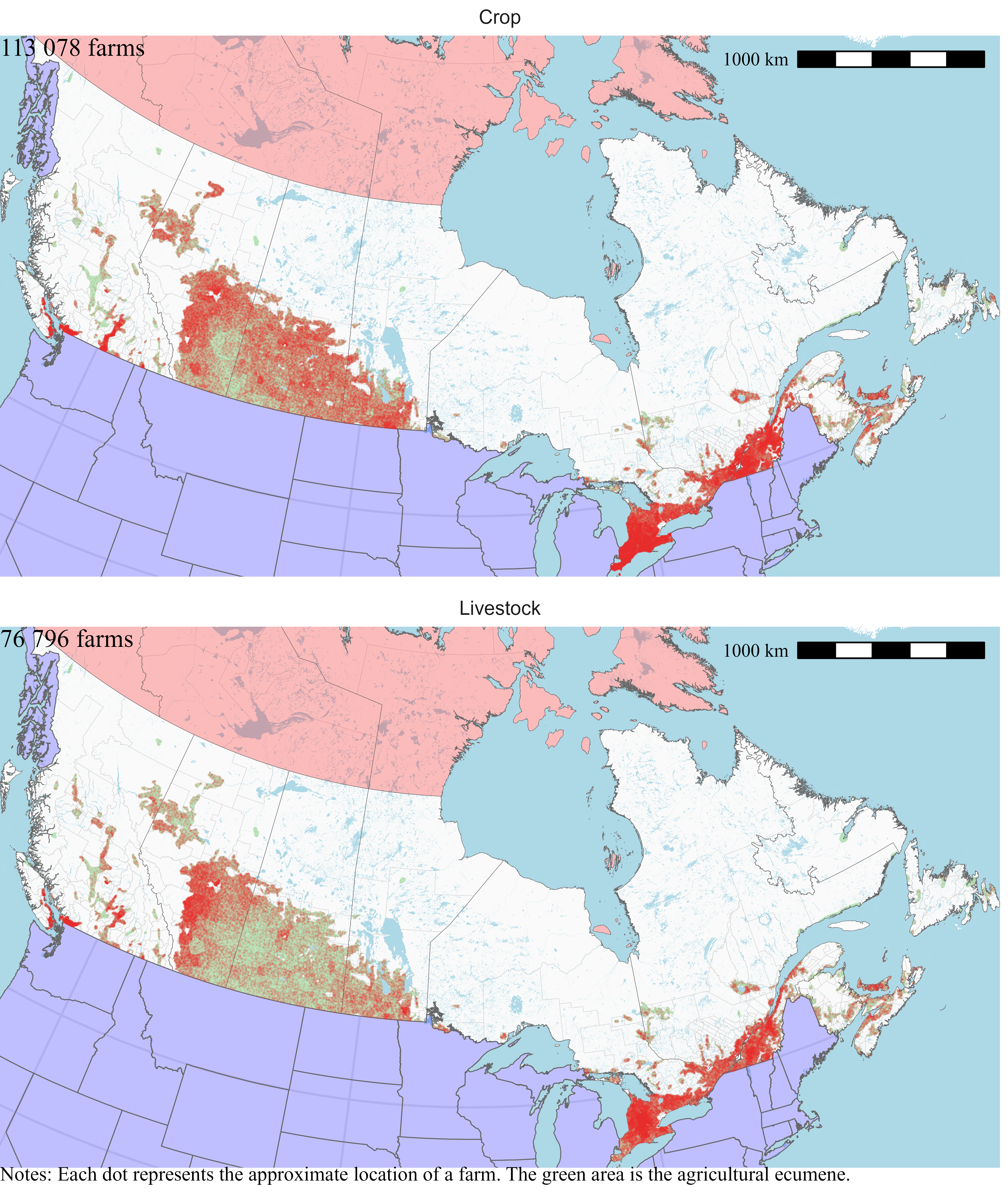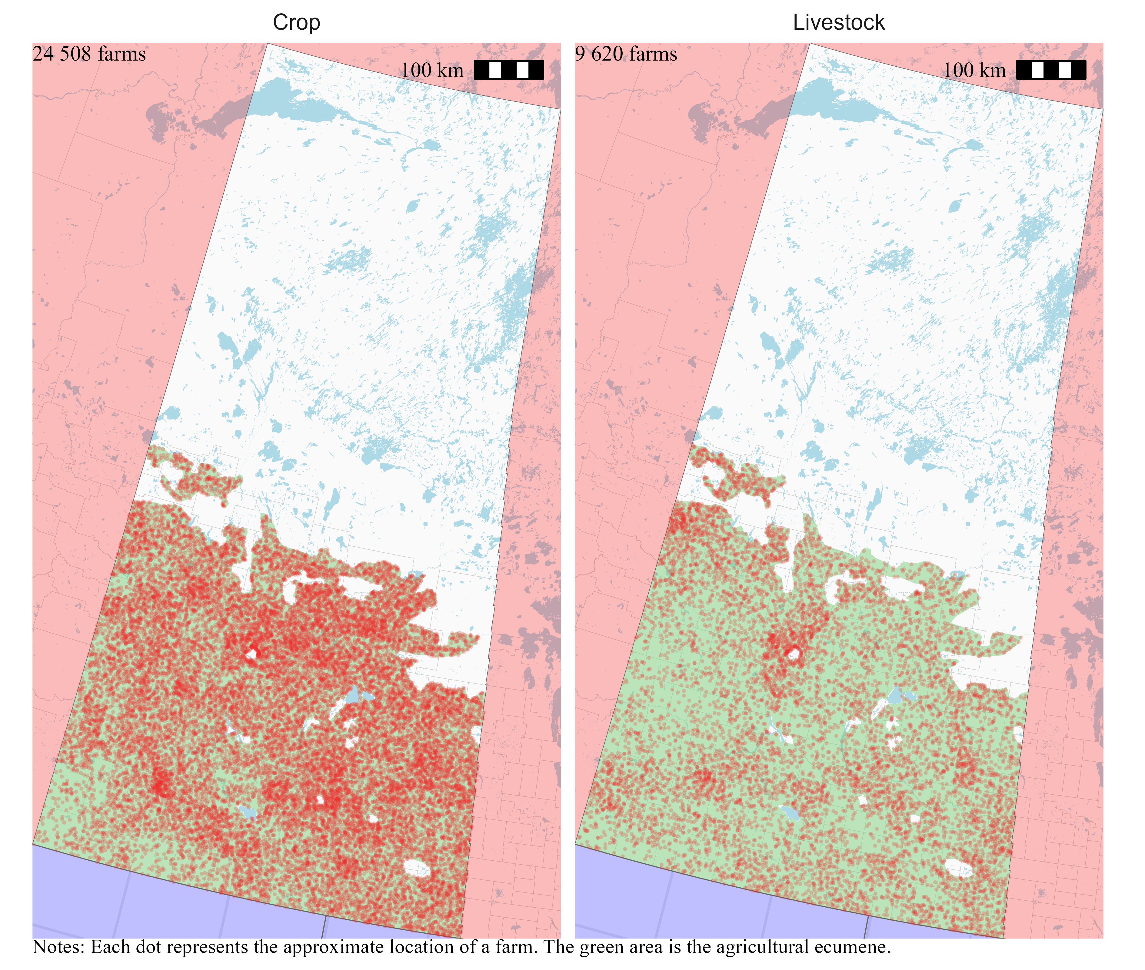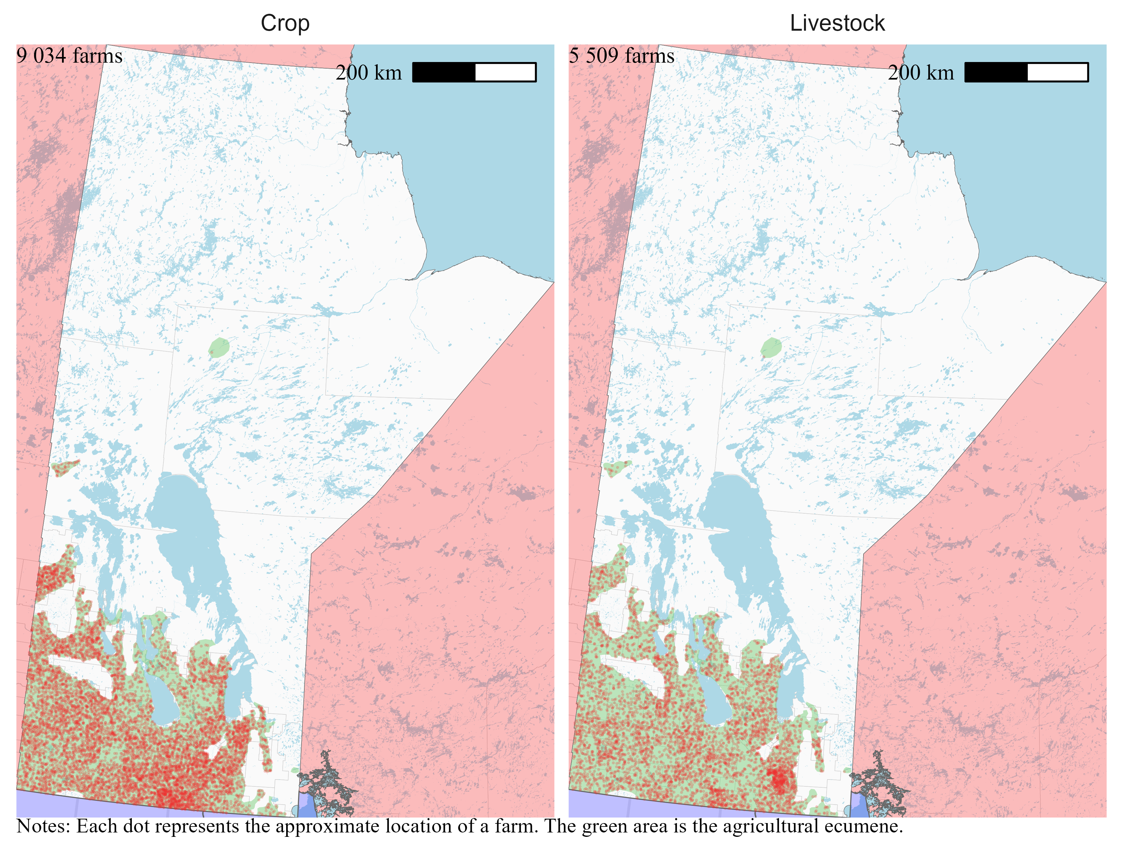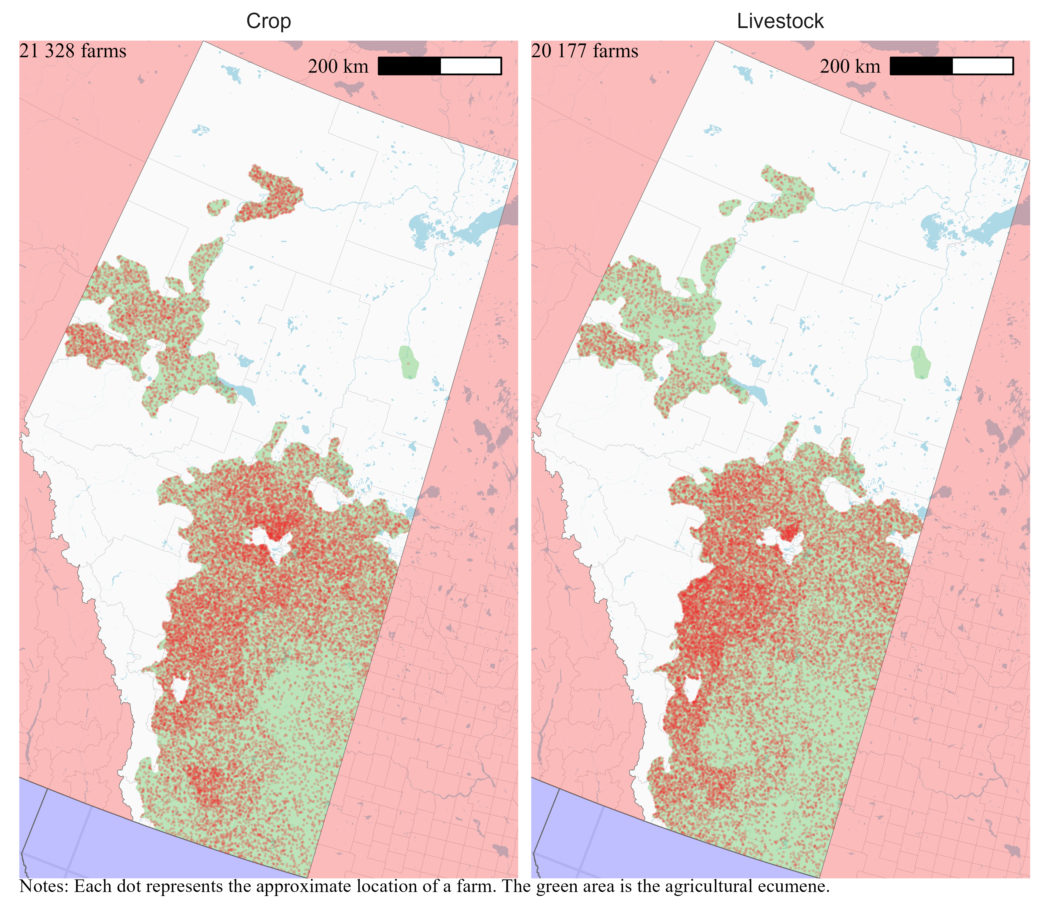 I locate farms only within the agricultural ecumene. Statistics Canada defines the agricultural ecumene as the areas where the country’s main agricultural activities take place. Limiting the random placement of farms at the intersection of their census consolidated subdivisions and the agricultural ecumene means that farms will be located on the maps in areas where we can expect to find them.