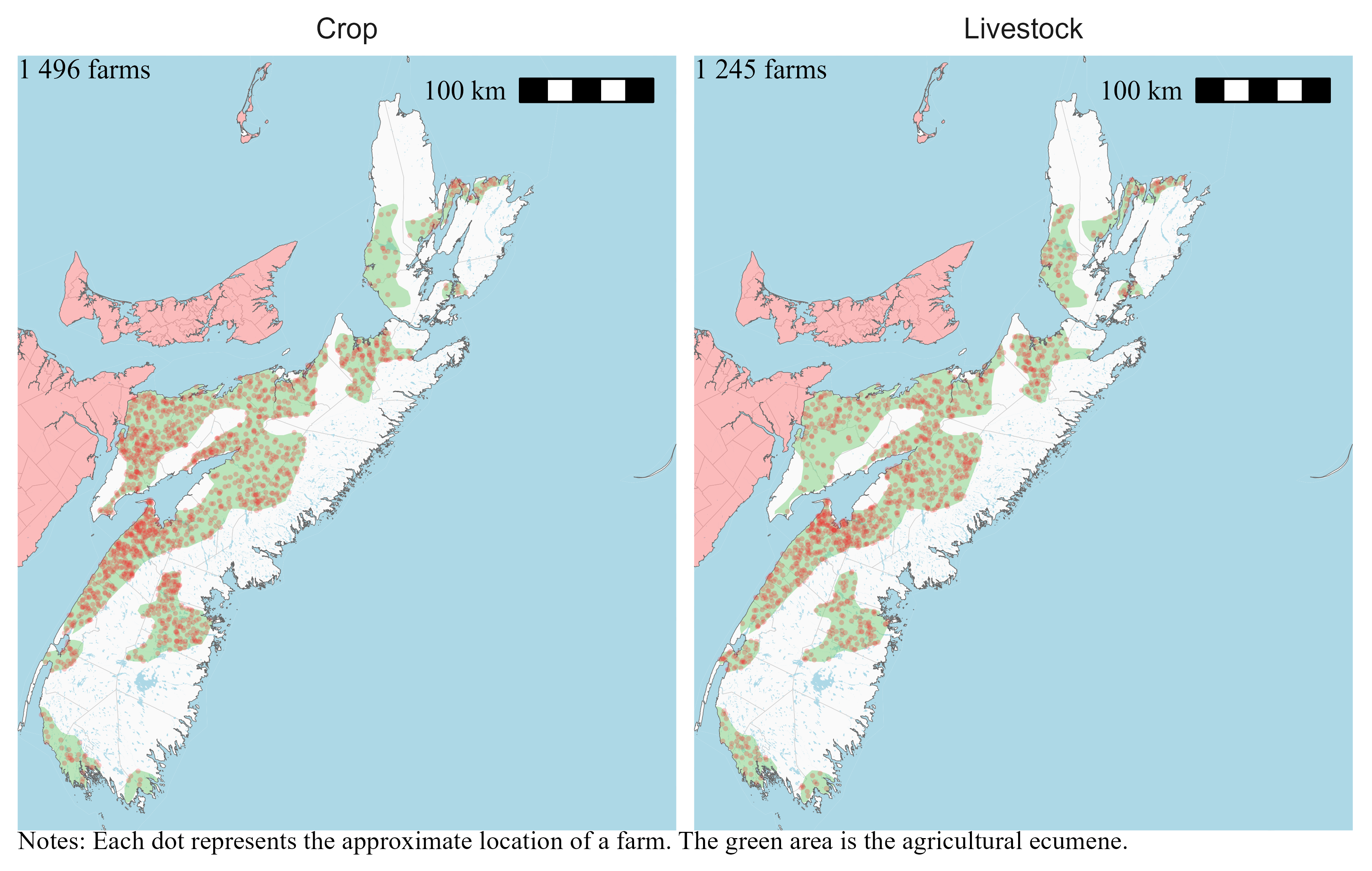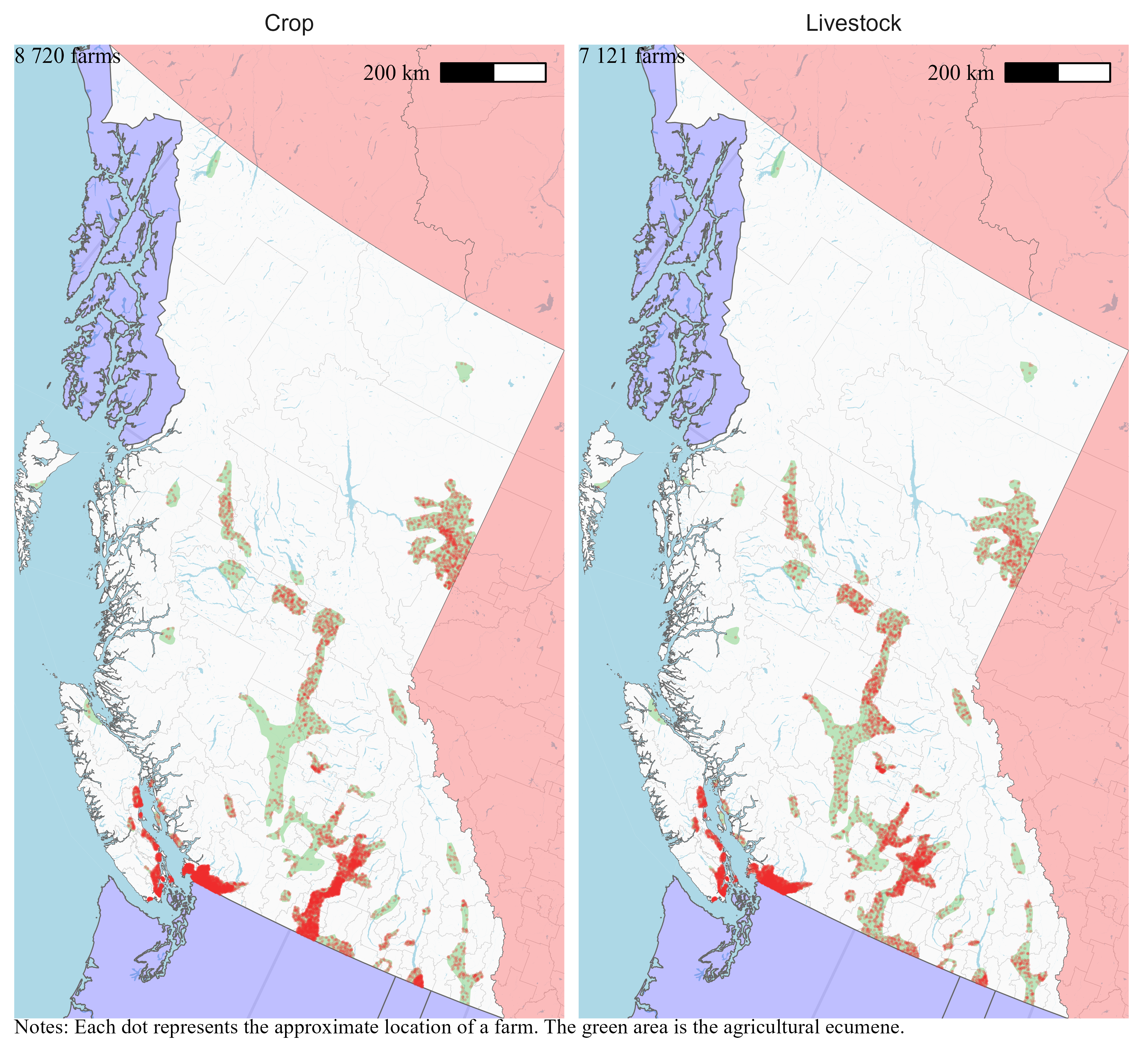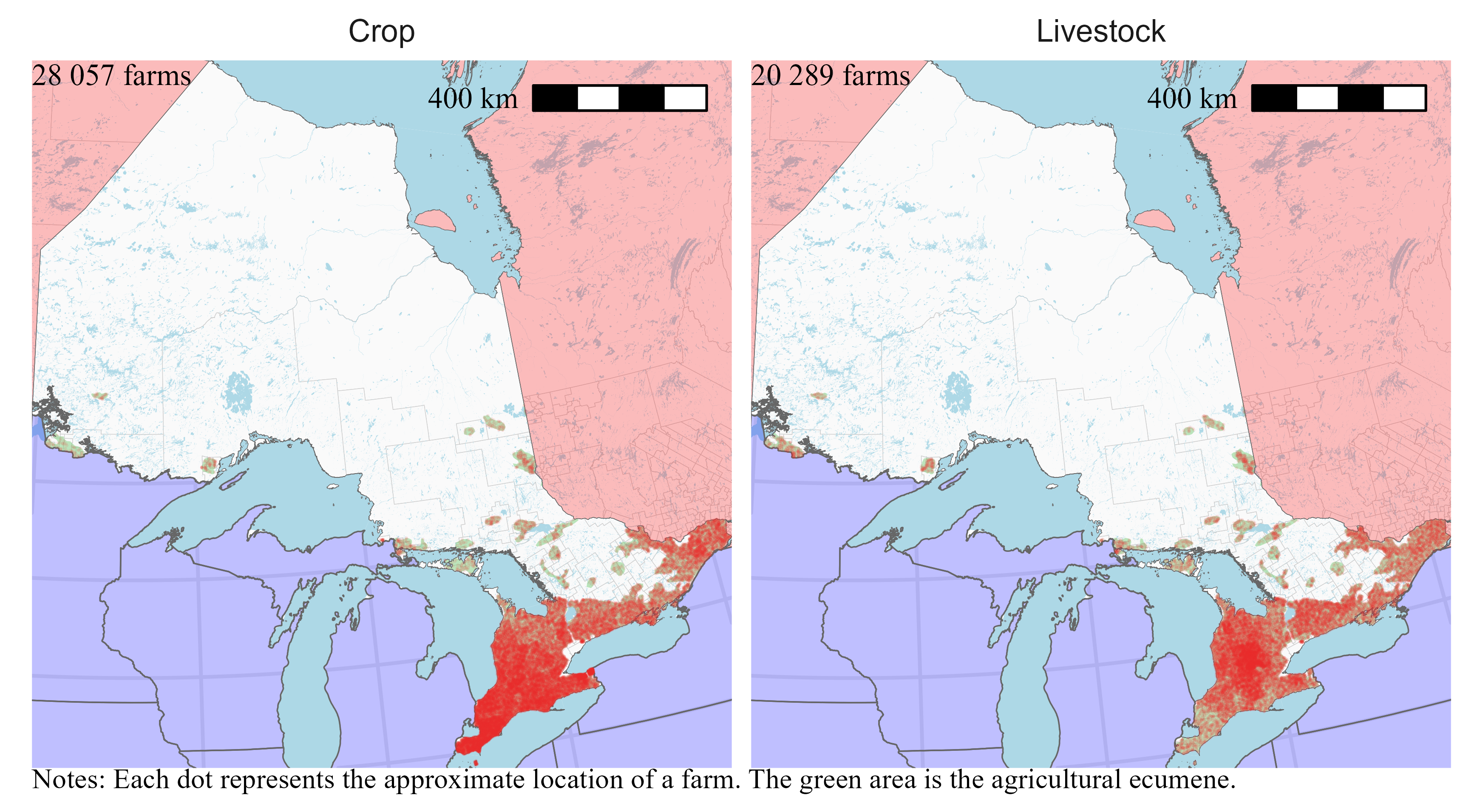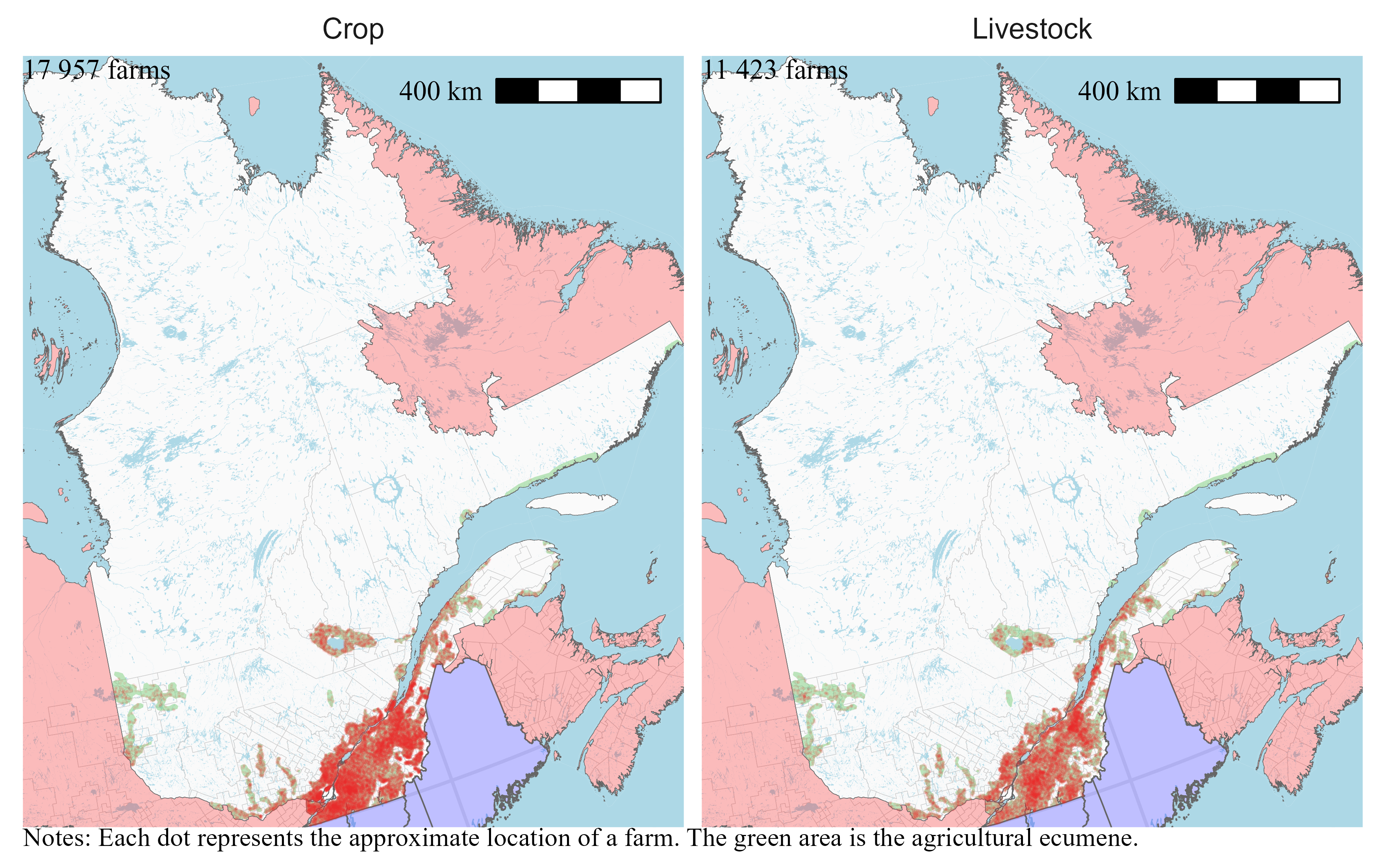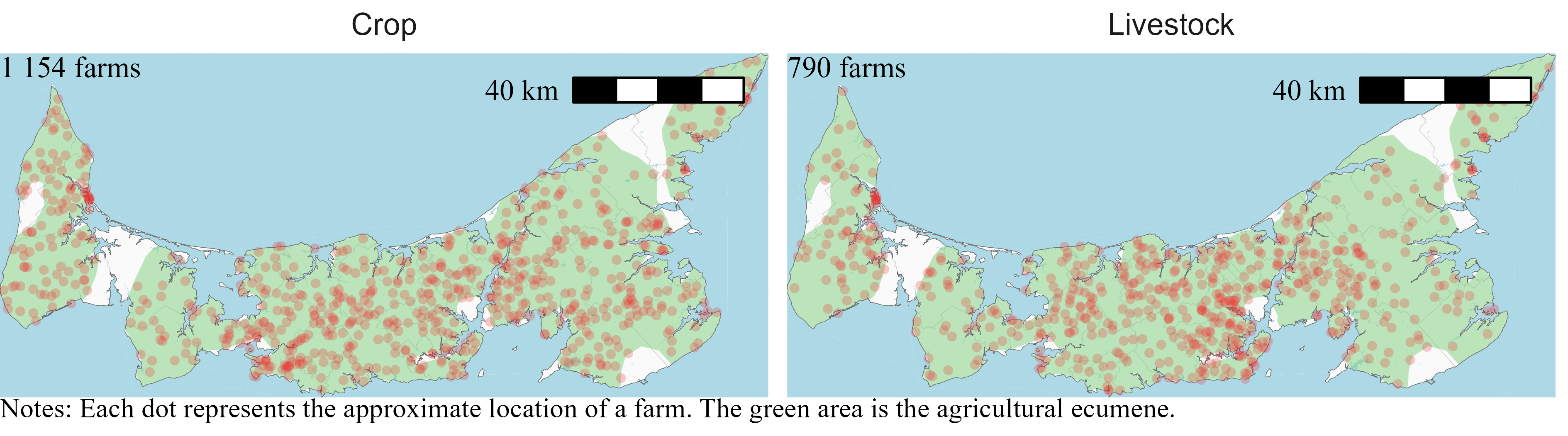 I locate farms only within the agricultural ecumene. Statistics Canada defines the agricultural ecumene as the areas where the country’s main agricultural activities take place. Limiting the random placement of farms at the intersection of their census consolidated subdivisions and the agricultural ecumene means that farms will be located on the maps in areas where we can expect to find them.