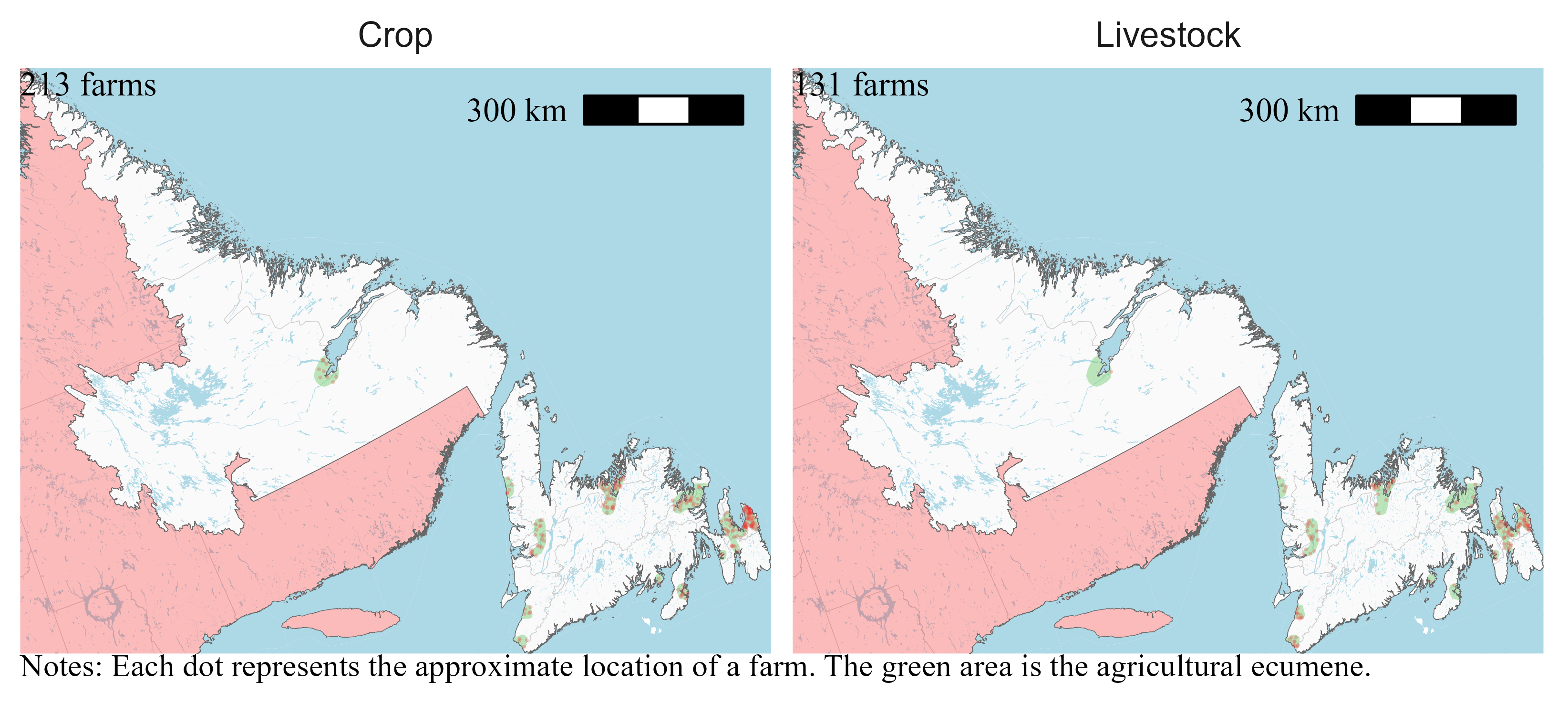 According to the Census, there were 344 farms in Newfoundland and Labrador in 2021. Farms are located on the coast with the largest concentration around Saint John in the East. There are farms in Labrador but I suspect that most are greenhouses.