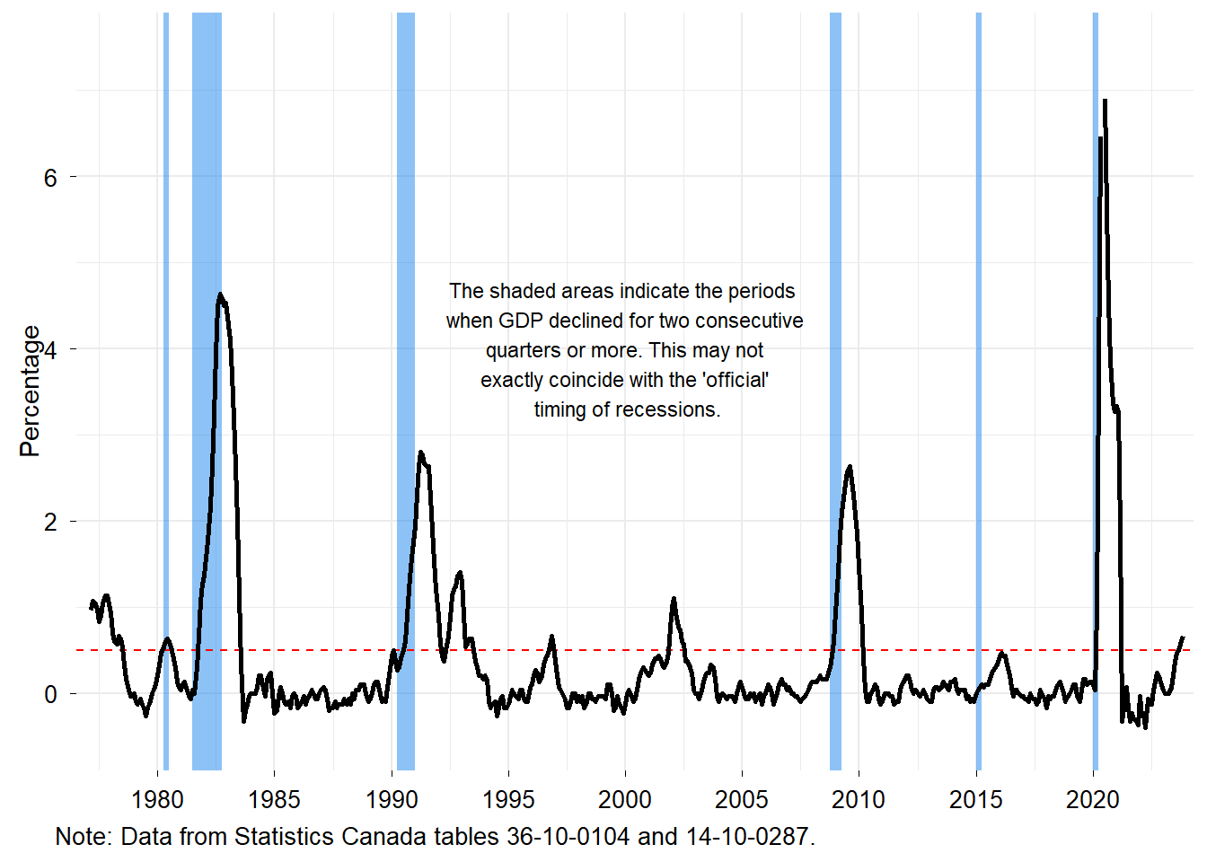 Why are we concerned about the risk of a recession? Recall that with the high inflation rates observed after the pandemic, the Bank of Canada adopted quantitative tightening measures and raised its policy rate to slow down inflation. The best outcome will be a soft landing where inflation returns to the 2% target, but the economy continues to grow.