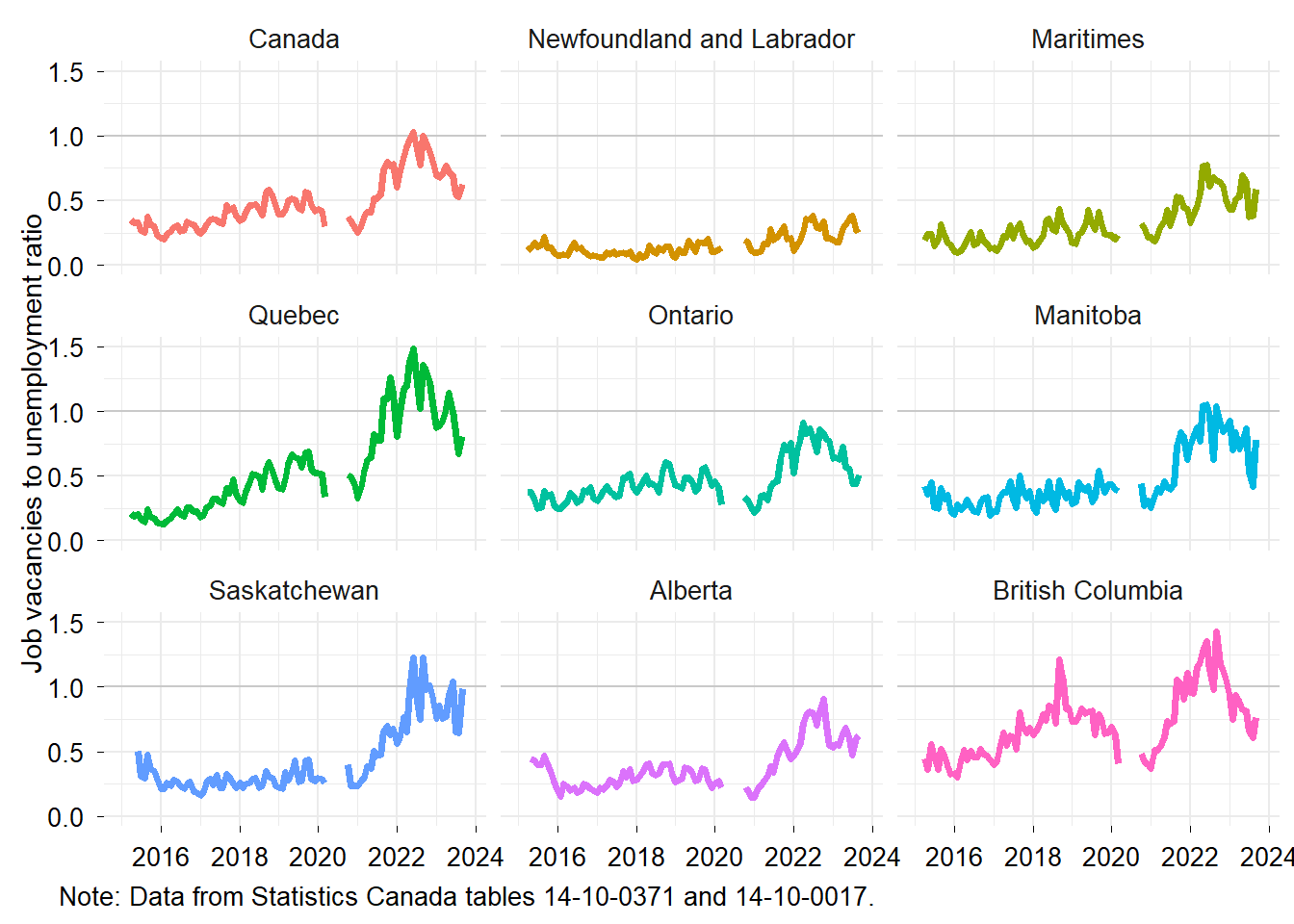 The figure below shows the ratio peaked in the middle of 2022. The labour market was particularly tight in Quebec and British Columbia, but has softened over the last year in part because of the influx of immigrants. Nonetheless, it is still strong compared to before the pandemic.