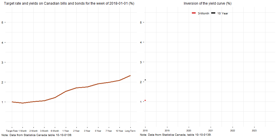 The animation below shows the yield curve between January 2018 and November 2023 in two panels. The panel on the left shows the yield curve: on the horizontal axis is maturity increasing from left to right and on the vertical axis is the yield. The panel on the left compares the yield on the 3-Month treasury bill and the 10-Year bond to determine when there is an inversion. The area in blue shows the spread when the yield on the 10-Year bond exceeds the yield on the 3-Month treasury bill. The area in orange shows the spread when the yield on the 10-Year bond is lower than the yield on the 3-Month treasury bill, that is, when the yield curve is inverted.