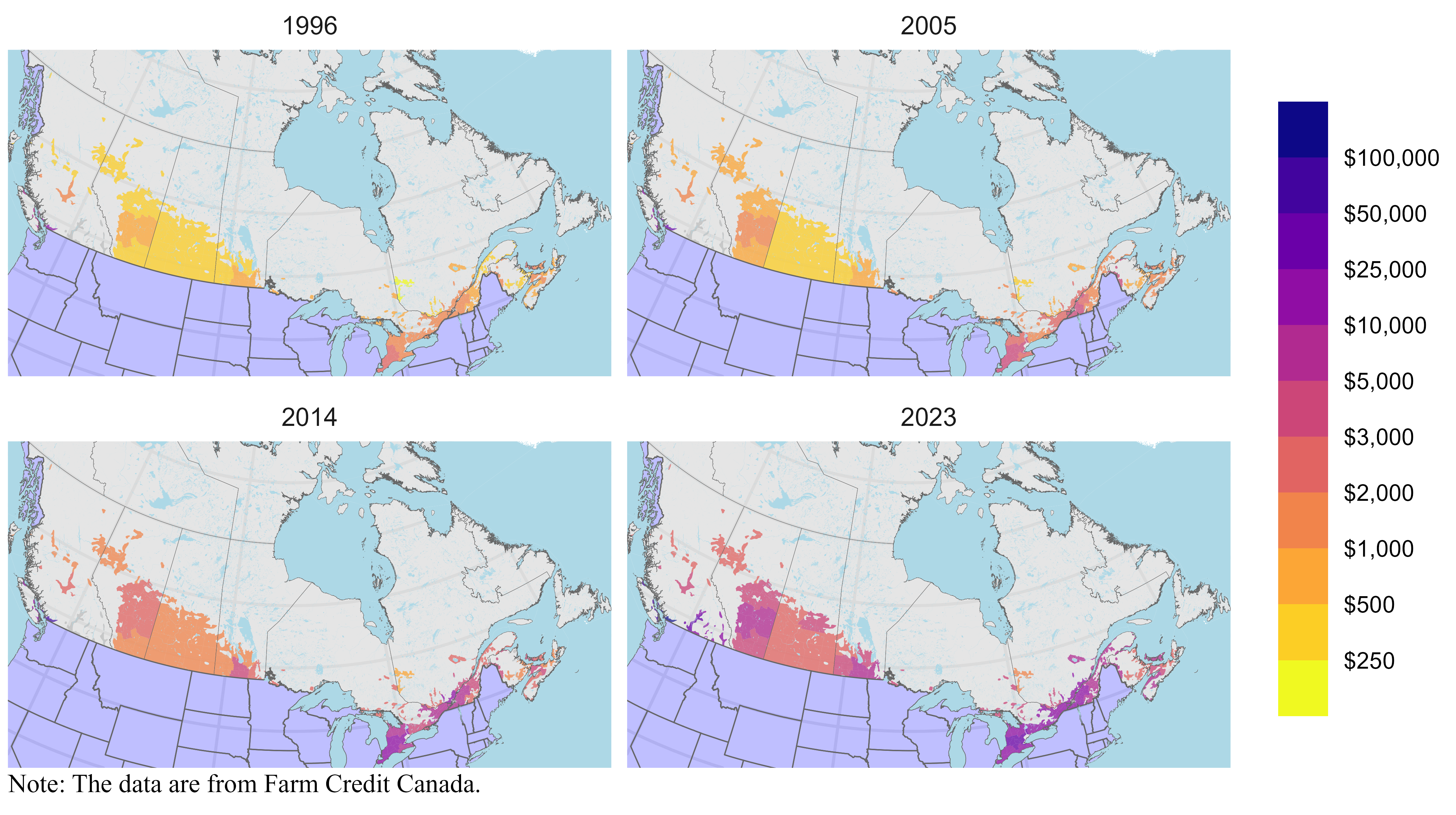 Figure 2 shows maps of farmland values for 1996, 2005, 2014 and 2023. As farmland values increase, the map darkens. This is true for all regions as farmland values have increased everywhere. There is consistency through time with the highest-valued land in 1996 being also the highest valued in 2023. The most valuable land is in the South Coast region near Vancouver in British Columbia. The agricultural land in that region cover a small area and is barely visible in the maps. Elsewhere, the most valuable land is along the Saint Lawrence River, by lake Erie and lake Ontario, where most of Canada’s population is located.