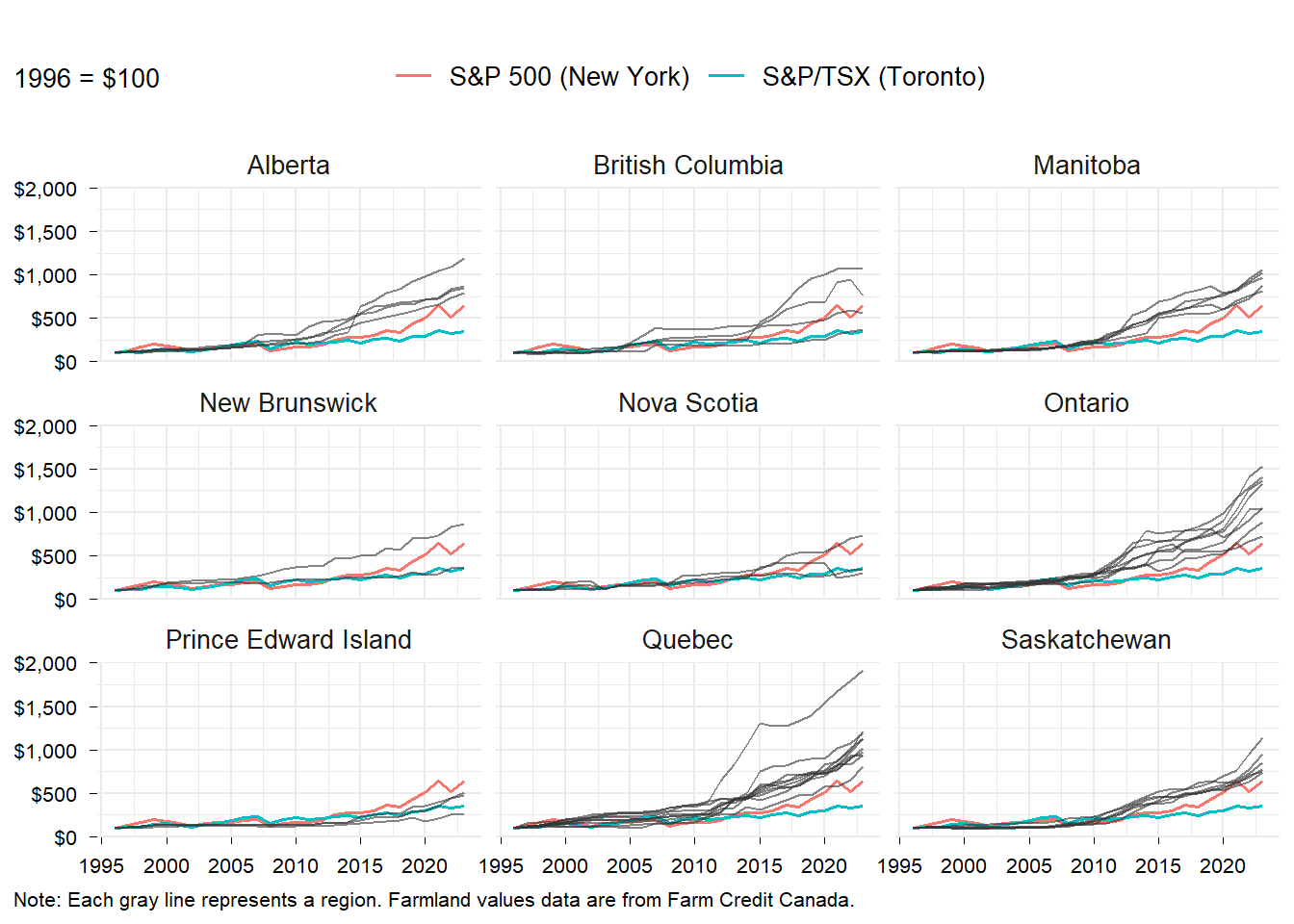 Figure 1 shows how $100 invested in farmland or in the stock market would have grown through time. Each gray line shows the return from an investment in farmland for a region. The S&P/TSX composite index is in blue and the S&P 500 is in red. The S&P/TSX composite index is a measure of the expected return from investing in Canadian stocks in Toronto while the S&P 500 is a measure of the expected return from investing in US stocks (New York).1 The S&P/TSX (Toronto) does not set the bar high in terms of yield, averaging a 4.8% annual return. The S&P 500 (New York) average annual return was 7.1%.
