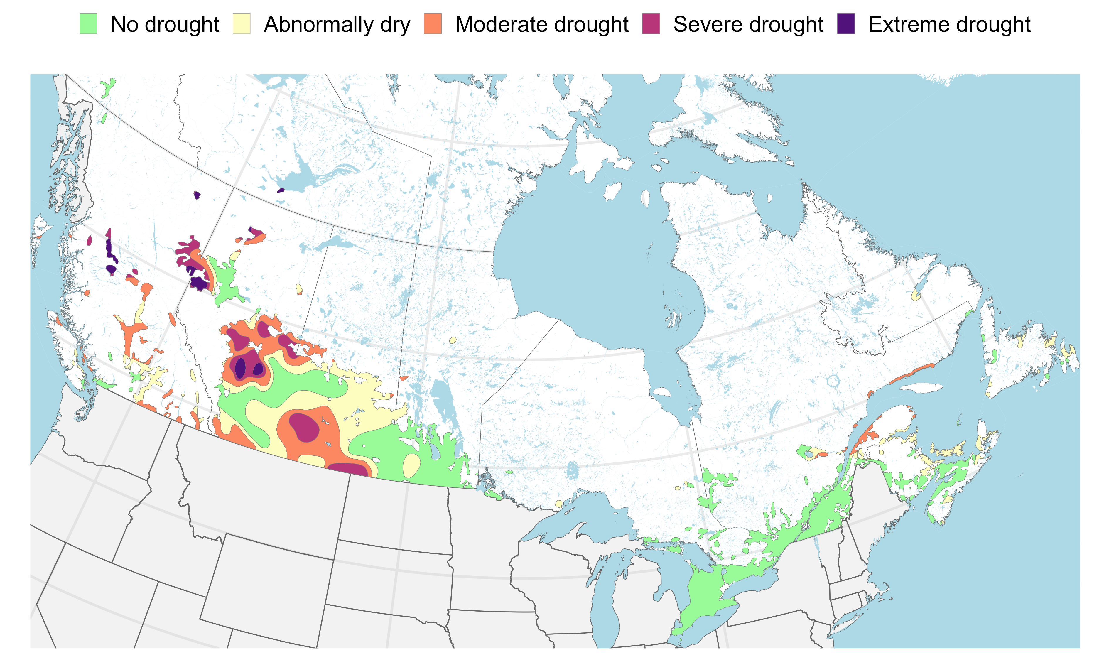 The map shows that a very significant part of Canada is under droughts of various intensities. The most intense drought region is Northern Alberta and the Northwest Territory. No region of Canada is an exceptional drought. The drought affects mostly northern regions where there is no agriculture. There are drought conditions in southern part of Canada but it is difficult to tell how much farm land is under drought.