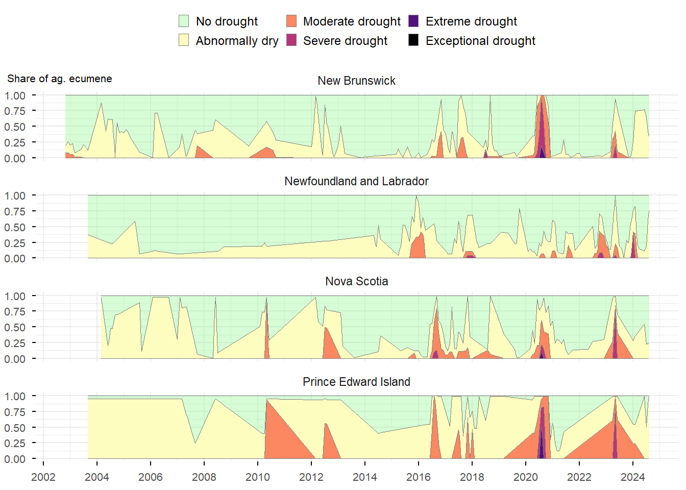 Atlantic provinces are not seriously affected by major drought events. The latest serious episode of drought was in 2020. Observe there were practically no drought before 2010.
