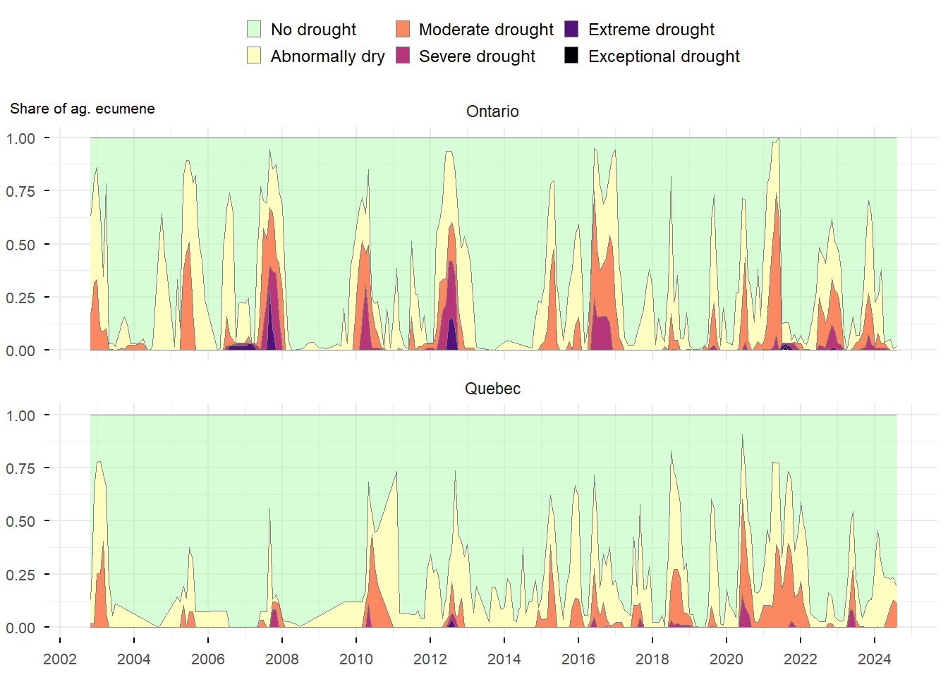 Quebec and Ontario are affected by episodes of drought, more frequently and more severely in Ontario. The most important drought was in 2007 and 2008 in Ontario. The data do not allow to identify episodes of excess moisture, which could be a more important problem than droughts in Quebec and Ontario.