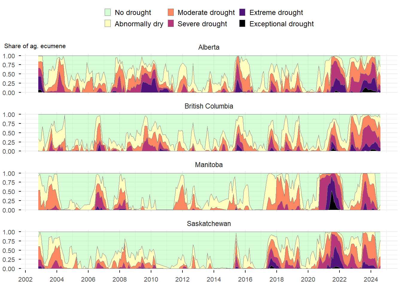 Droughts are frequent and sometimes severe in Western Canada. Alberta and British Columbia are the driest provinces. The 2021-22 drought was widespread and intense with some areas under exceptional drought conditions. That drought seems to have never ended in Alberta, but Figure 4 does no allow us to observe whether it is the same areas that are continuously affected by drought conditions. British Columbia is under the worst drought conditions since the data begin in 2002. Large squats of the agricultural ecumene in Saskatchewan have stayed under drought conditions since 2001. Drought conditions returned to Manitoba in 2023 and 2024 but have recently disappeared as Figure 2 shows.