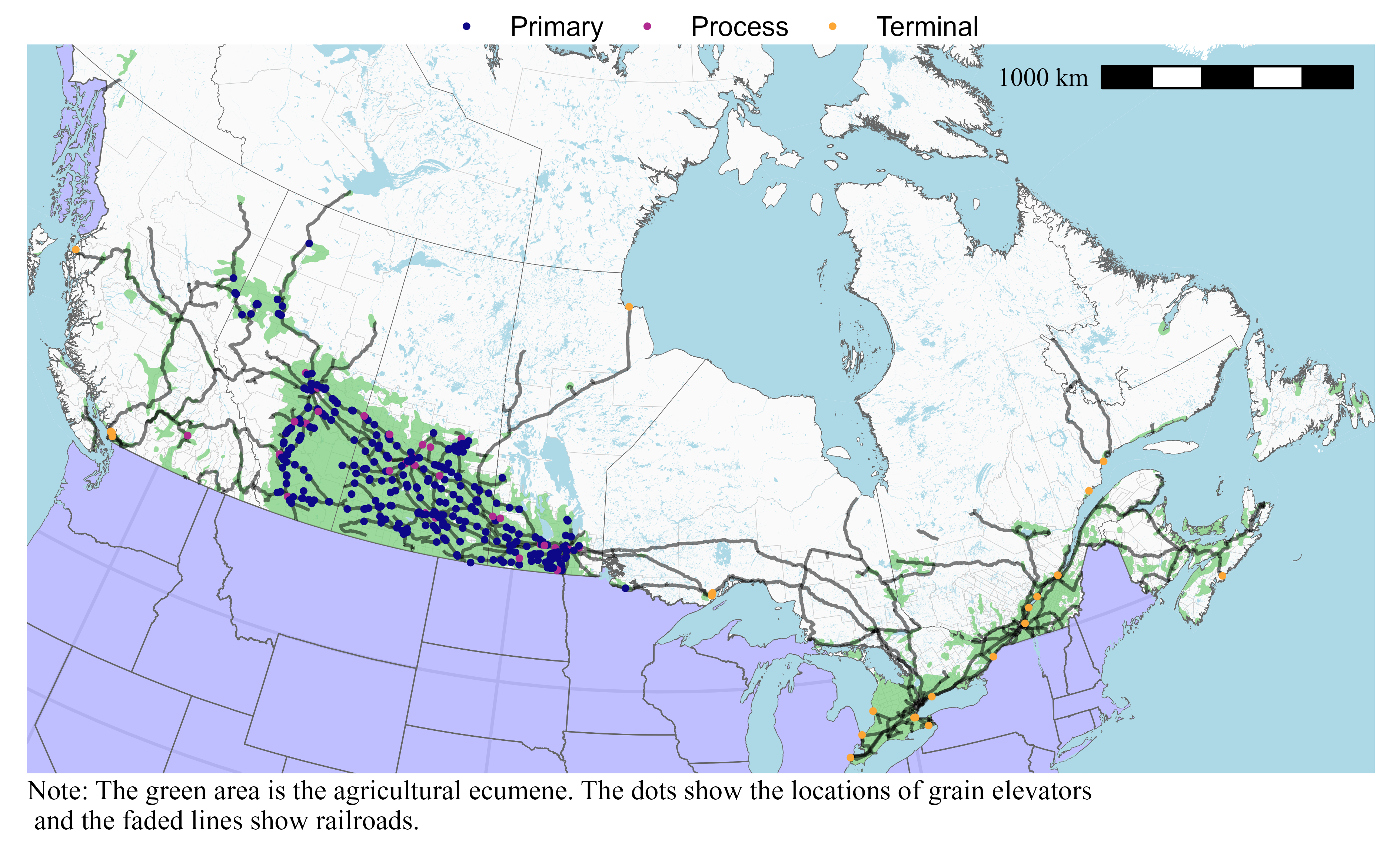 This post shows how infrastructure in Canada covers the agricultural ecumene. One caveat is that in order to show infrastructure, their size is disproportionate in the figures below, and therefore they do not occupy as much land as the figures suggest. The maps do also not allow to comment on issues regarding land use that are often at the local level. The data are from the Government of Canada and in some instances their coverage appears incomplete. I show maps for the entire Canada but data are available to produce maps the provincial level.