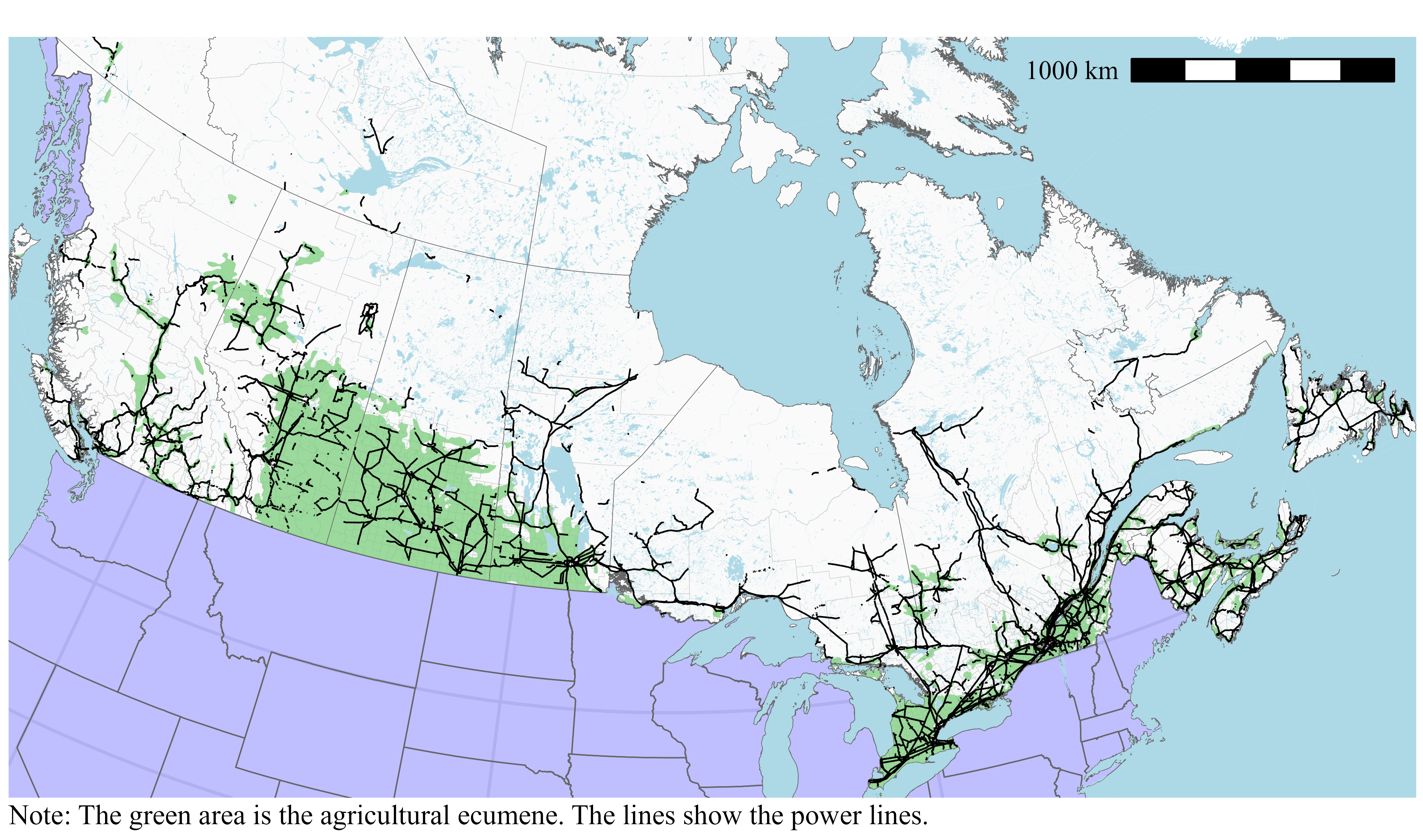 One particularity of Canada is that there are several hydropower stations located north, far away from population centres. This is particularly obvious in Manitoba, in Ontario and Quebec. The greatest concentrations of power lines are in southern Quebec and southern Ontario, over the agricultural ecumene. Elsewhere, the concentration of power lines is much lower.
