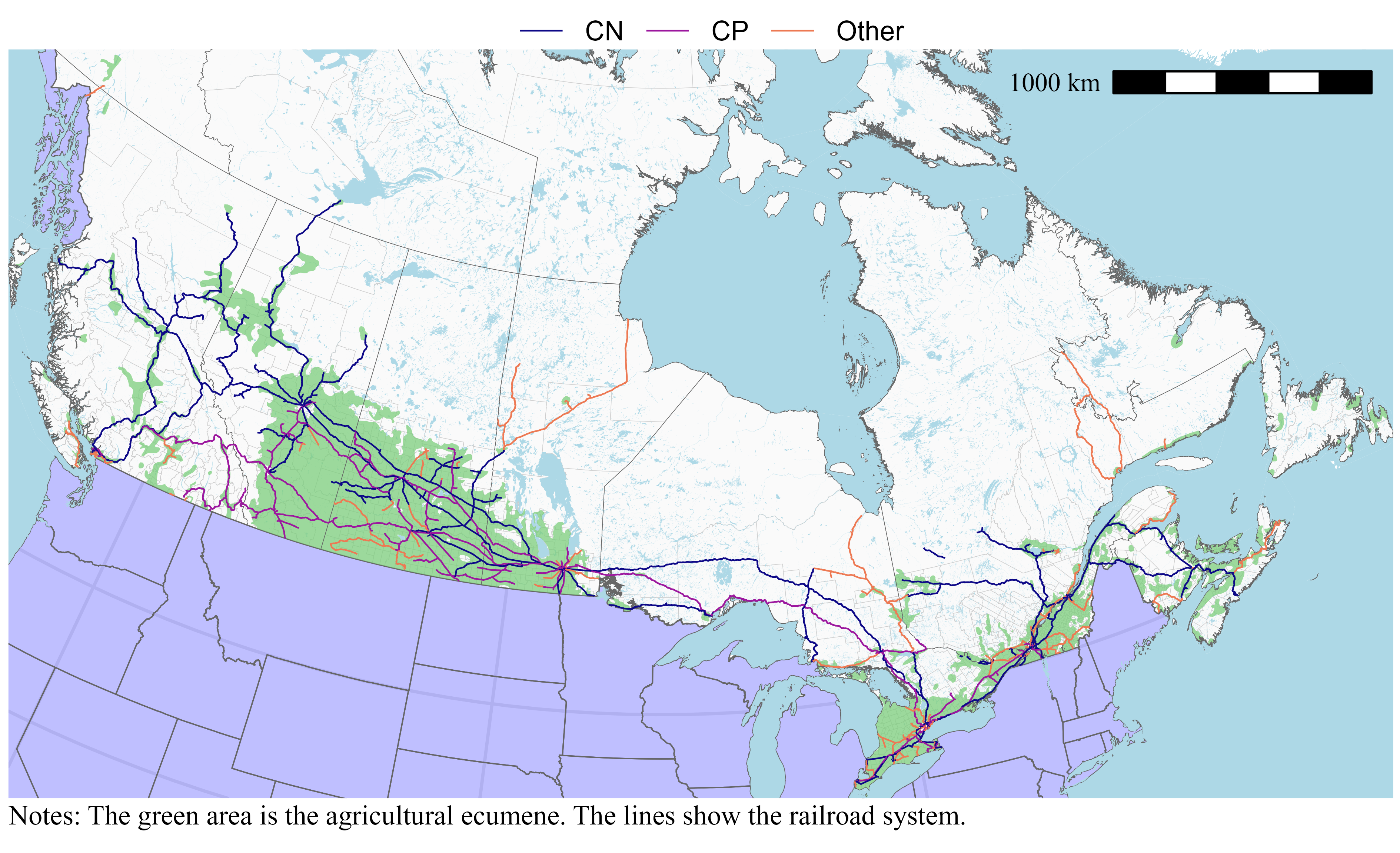 The Canadian National (CN) and Canadian Pacific (CP) are the two main rail companies in Canada. The Grain Growers of Canada observes that 94 percent of Canadian grain is shipped by rail. It is not surprising to find that the railroad system covers well the agricultural ecumene in the Prairies and allows for the export of grain through Eastern or Western ports. In the East, railroads are less crucial to agriculture because of the commodities produced, the proximity of the Saint-Lawrence Seaway and the existing road network.