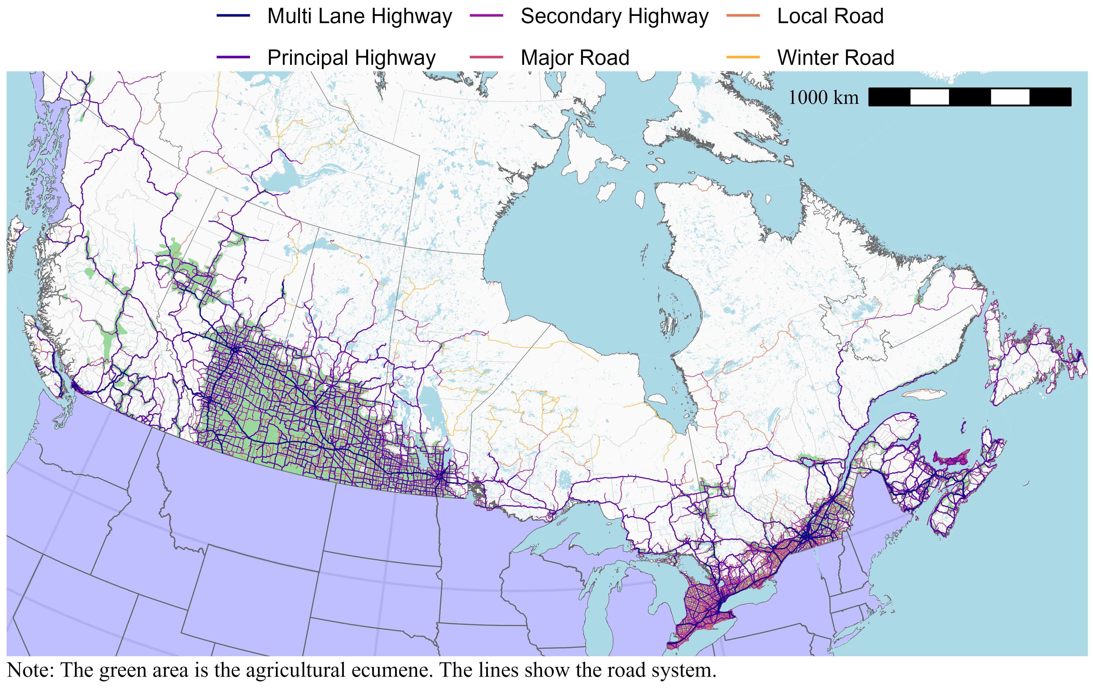 The road system is extensive and for the most part is built on the agricultural ecumene. Outside of the agricultural ecumene, there are roads mainly for logging and mining, and to reach remote communities. The road system is denser on the agricultural ecumene than outside of it, especially in Quebec and Ontario. The agricultural ecumene in the Prairies is gridded with roads.