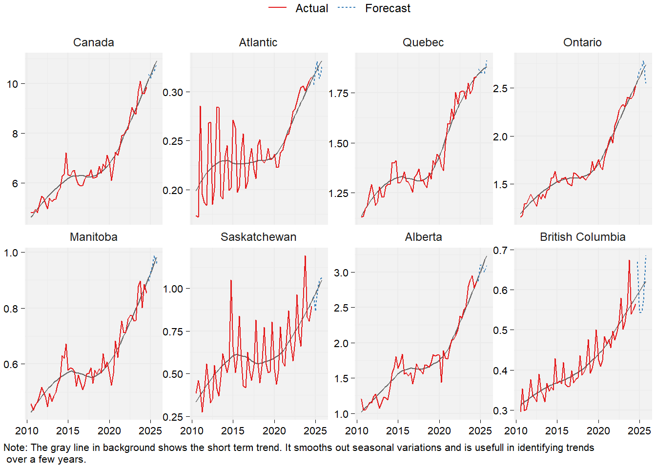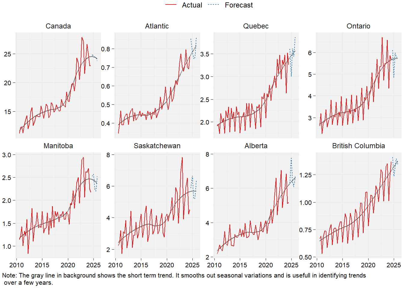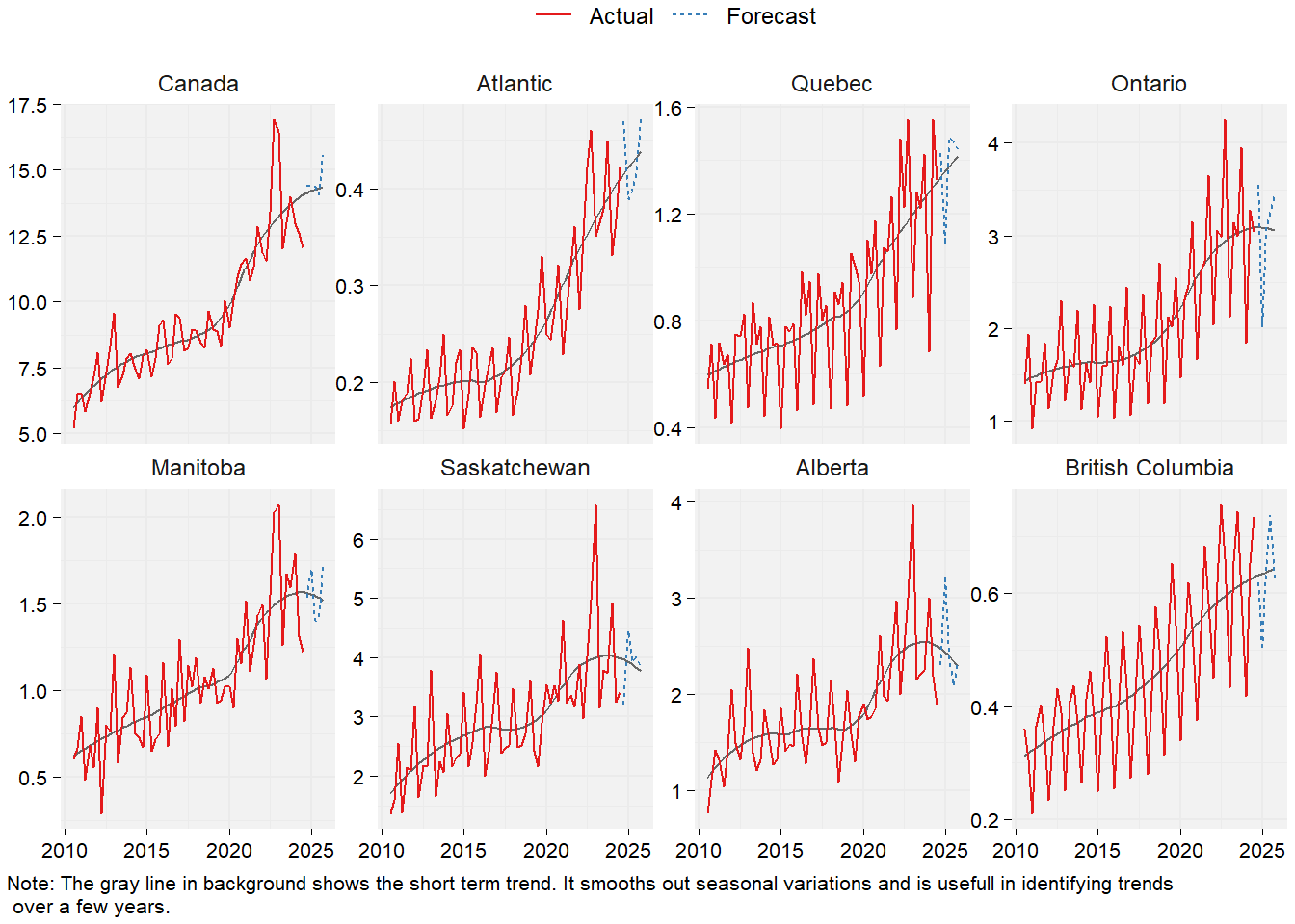 The size of the 2022 peak depends on each province crop mix. The Prairies are important producers of commodity crops and we observe much more prominent peaks in those provinces. In Quebec and Ontario, the peaks are smaller, as fruit and vegetable productions are relatively more important.