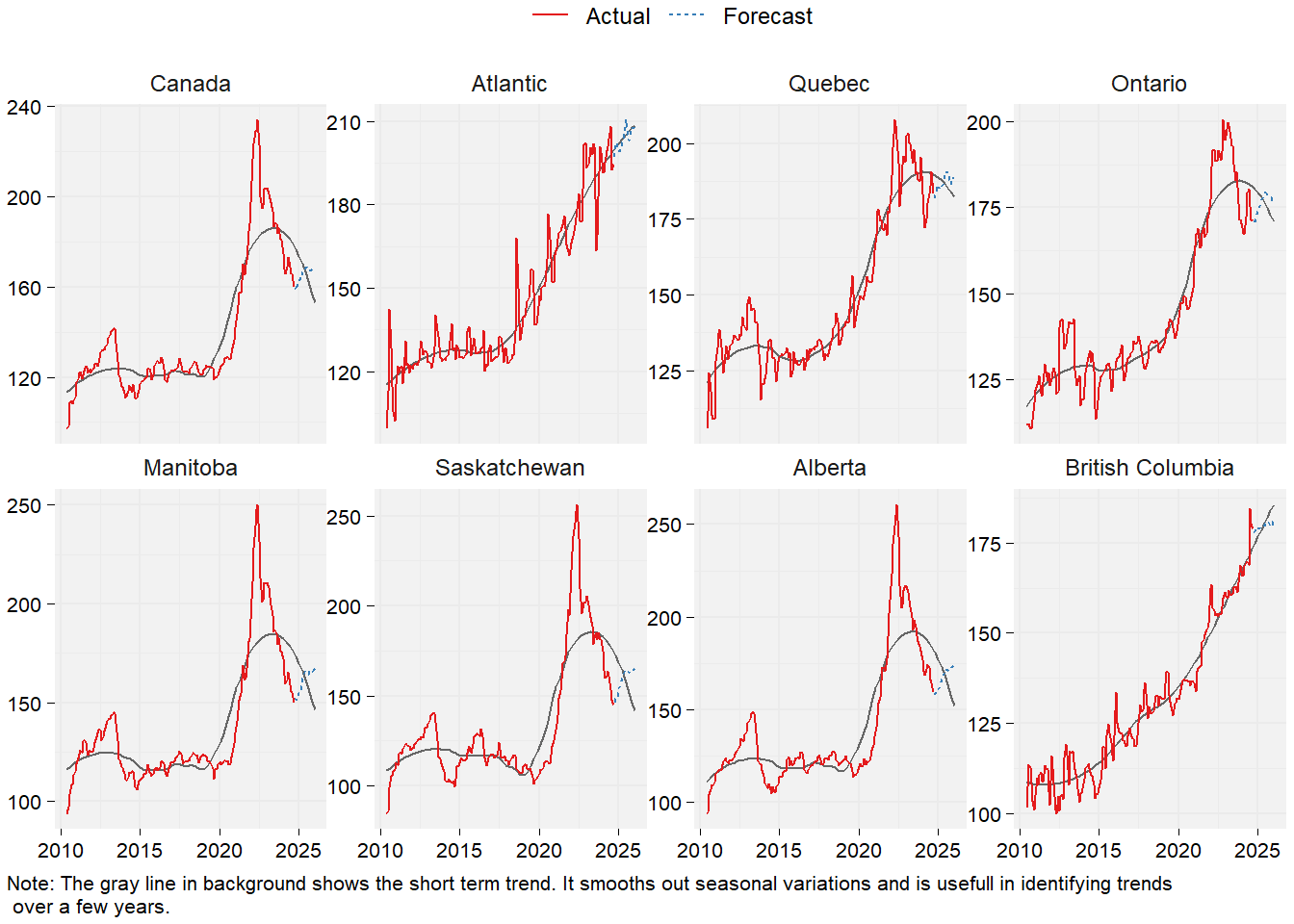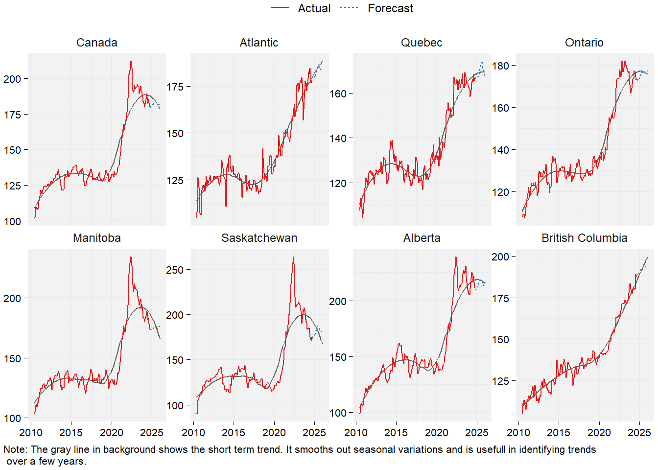 For all provinces, except for the Atlantic and British Columbia, the crop price index peaked in 2022 and has trended down since. These trends follow from commodity crop prices. Forecasts do not indicate a significant potential for prices to rebound over the next year.