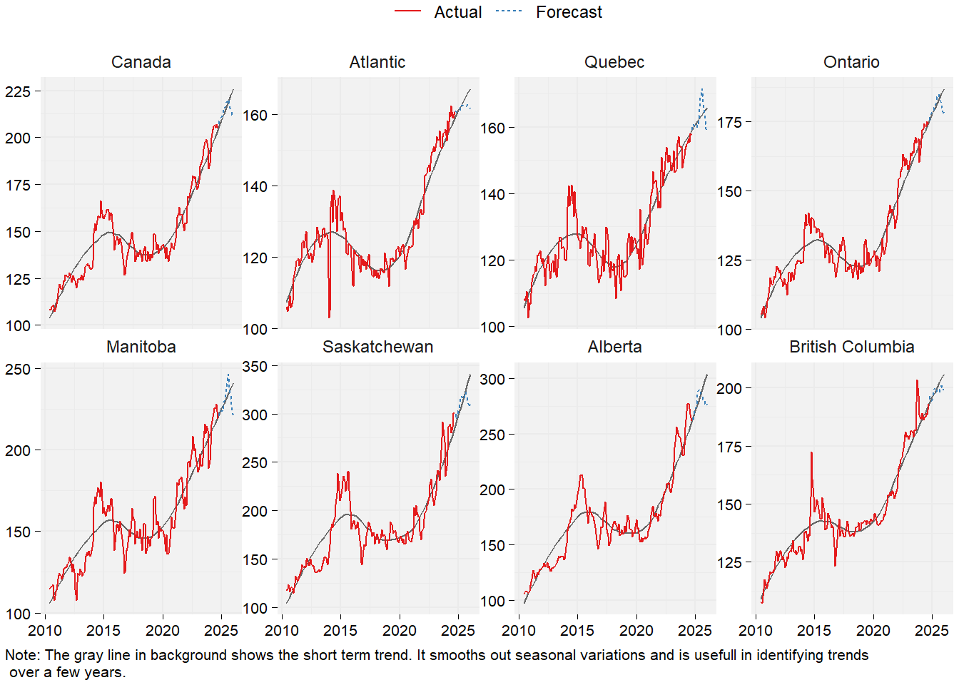 When considering total farm price indexes, we observe that in provinces who largely depend on commodity crops, in particular Manitoba and Saskatchewan, prices peaked in 2022 and then have dropped since. The other Prairies Province, Alberta, has a large crop sector but also a large cattle sector. Prices have declined in that province but less so than Manitoba and Saskatchewan. Quebec and Ontario have diversified agriculture production and prices have stagnated since 2022, but have been volatile. For the Atlantic and British Columbia, prices have generally been trending up since 2010.