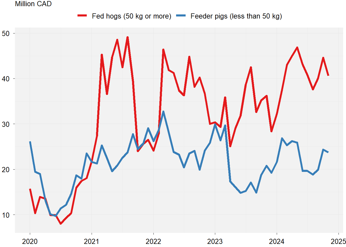 Figure 1 shows monthly Canadian exports of live pigs to the United States since 2020. Exports of fed pigs are seasonal but have been relatively stable since 2001 on an annual level. Likewise, exports of feeder pigs have been holding fairly steady.