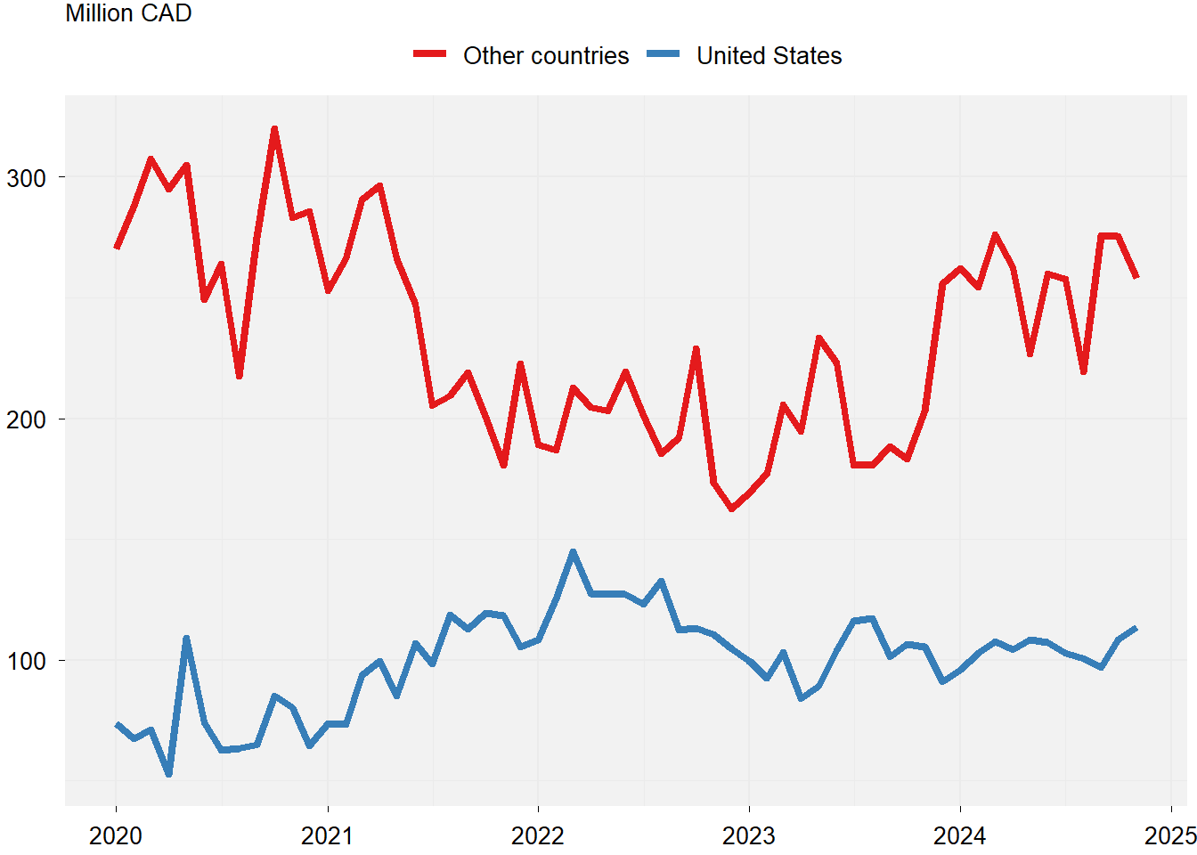 Figure 2 shows monthly Canadian exports of pork to the United States and to other countries. In 2020 and 2021, exports to other countries were boosted by the outbreak of African swine fever in China. China’s hog inventory has since recovered and the global demand has diminished. Pork exports to the United States are about a quarter of Canada’s total, and have been holding steady.