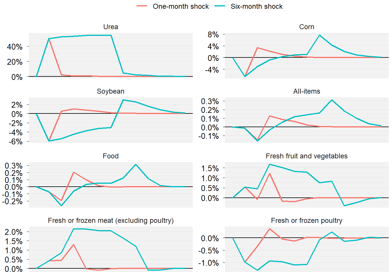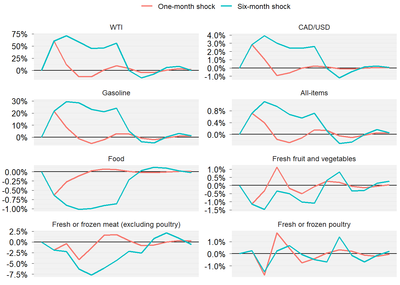 Figure 1 shows that the Food price index decline in response to the oil shock. The impact is small: -0.2% for the one-month shock and up to -0.6% for the six-month shock. It is the change in the exchange rate that drives the decline in food prices. Price indices for Fresh fruit and vegetables and Fresh and frozen meat (excluding poultry) decline more than for food in general. For Fresh or frozen poultry, the price index moves up and down around zero. I do not show confidence intervals in Figure 1, but those for the food price indices all include zero. This tells us that the impacts of the oil shock on food prices are not statistically different from zero, however.