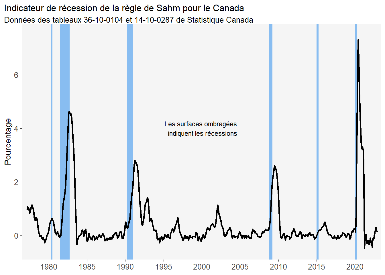 L’indicateur de récession de la règle de Sahm a été proposé par Claudia Sahm en 2019. Les données sur le PIB sont disponibles avec des retards importants de sorte qu’un pays apprend qu’il est en récession plusieurs mois après le début de celle-ci. L’indicateur de récession de la règle de Sahm utilise les données sur le chômage, disponibles avant les données sur le PIB, comme signal précoce d’un ralentissement économique. Claudia Sahm propose l’instauration de paiements directs aux individus lorsque l’indicateur dépasse un seuil de 0,50 % (d’où la règle), ce qui rendrait une réponse du gouvernement à une récession rapide et automatique. La règle Sahm faisait même partie de la plate-forme du Parti Conservateur lors des élections fédérales de 2021.