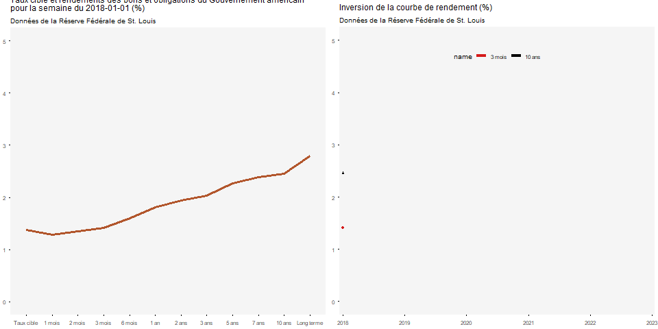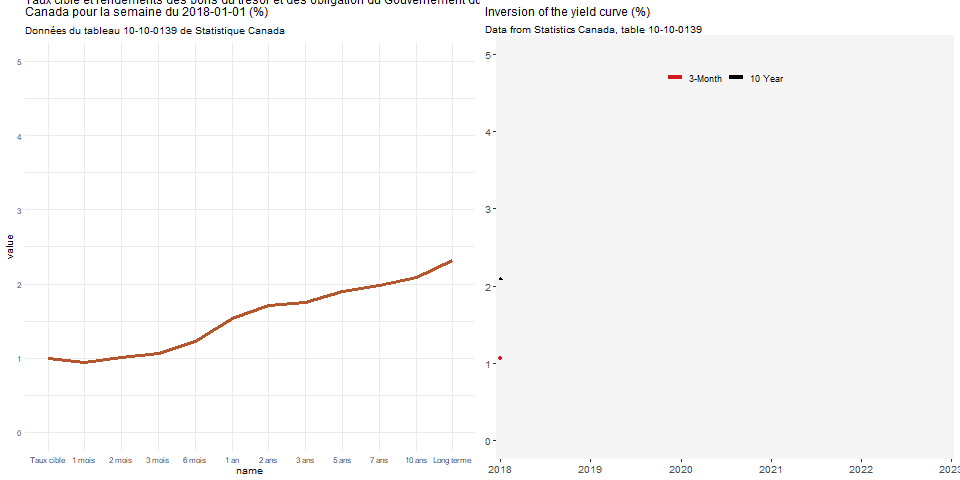 L’animation ci-dessous montre la courbe de rendement entre janvier 2018 et décembre 2022 en utilisant deux panneaux. Le panneau de gauche montre la courbe de rendement : sur l’axe horizontal, l’échéance augmente de gauche à droite et sur l’axe vertical se trouve le rendement. Le panneau de gauche compare le rendement du bon du Trésor à 3 mois et de l’obligation du Gouvernement du Canada à 10 ans. La zone en bleu montre l’écart lorsque le rendement de l’obligation à 10 ans dépasse le rendement du bon du Trésor à 3 mois. La zone en orange montre l’écart lorsque le rendement de l’obligation à 10 ans est inférieur au rendement du bon du Trésor à 3 mois, c’est-à-dire lorsque la courbe de rendement est inversée.