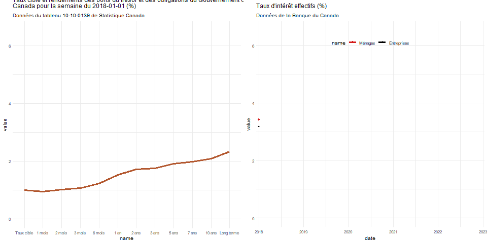 L’animation suivante présente cette fois les taux d’intérêt effectifs payés par les ménages et les entreprises sur le panneau de droite. L’animation montre que les taux d’intérêt effectifs des ménages et des entreprises répondent aux variations du taux cible de la BdC et aux mouvements de la courbe de rendement. Les taux d’intérêt ont grimpé à un rythme spectaculaire depuis que la BdC a commencé à relever son taux cible en février. Remarquez également le renversement.1 Les ménages paient généralement un taux d’intérêt effectif plus élevé que les entreprises, mais ce n’est plus le cas depuis le mois d’août.