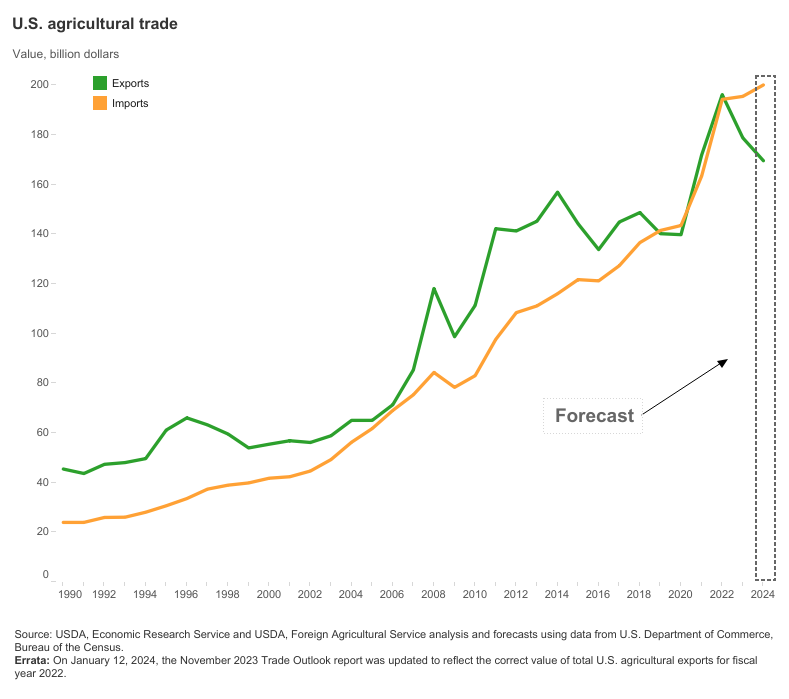 Les tendances récentes du commerce agricole américain ont motivé la création du caucus. La figure ci-dessous, tirée de l’Economic Research Service (ERS) du Département de l’agriculture des États-Unis (USDA) (en anglais seulement), montre que les États-Unis ont été historiquement un exportateur net de produits agricoles. La situation a changé vers 2019 lorsque les États-Unis ont enregistré un premier déficit commercial. Le USDA prévoit que le déficit commercial agricole des États-Unis augmentera en 2024.