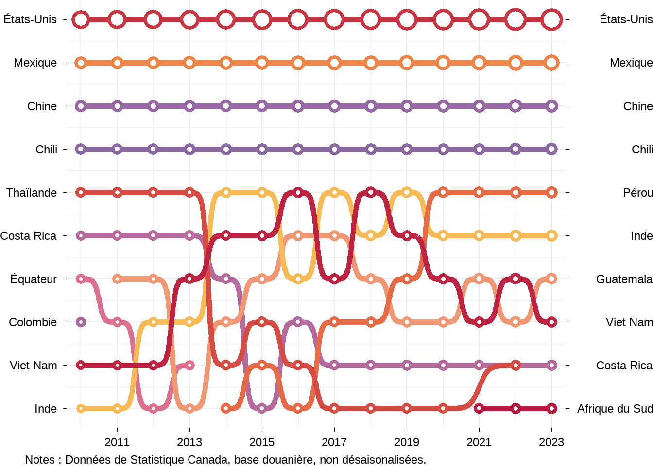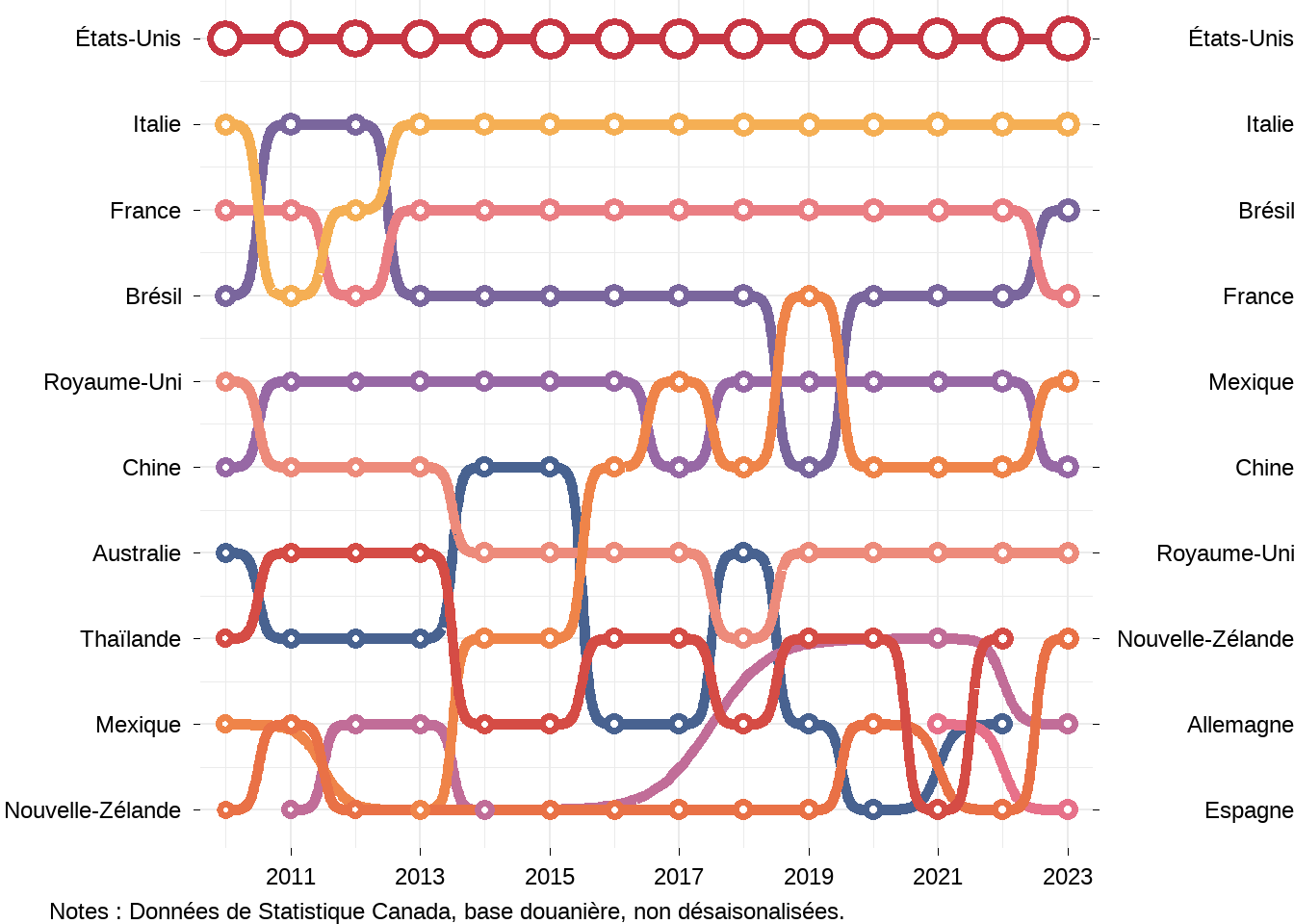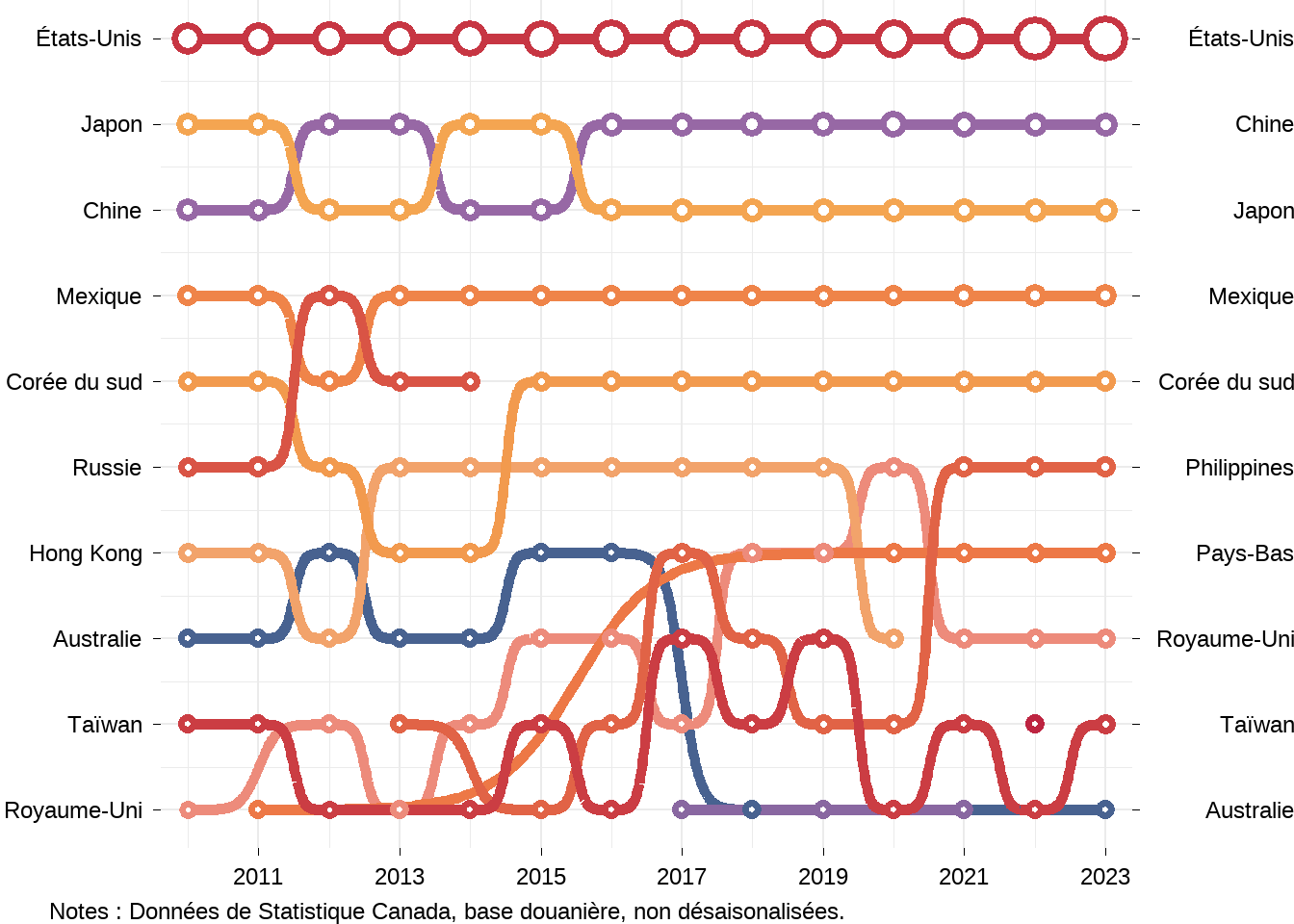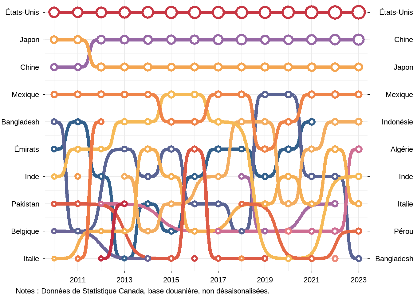 Examinons maintenant qui sont les principaux partenaires commerciaux du Canada dans le secteur agroalimentaire. J’utiliserai des graphiques de bosses (bump chart en anglais) pour montrer les dix principaux partenaires commerciaux du Canada au fils du temps. En haut des graphiques on retrouve le premier partenaire commercial du Canada et au bas le dixième partenaire commercial du Canada. Les graphiques ne montrent pas les valeurs commerciales, mais la taille des cercles montre l’importance relative des relations commerciales, un cercle plus grand indiquant une valeur plus élevée.