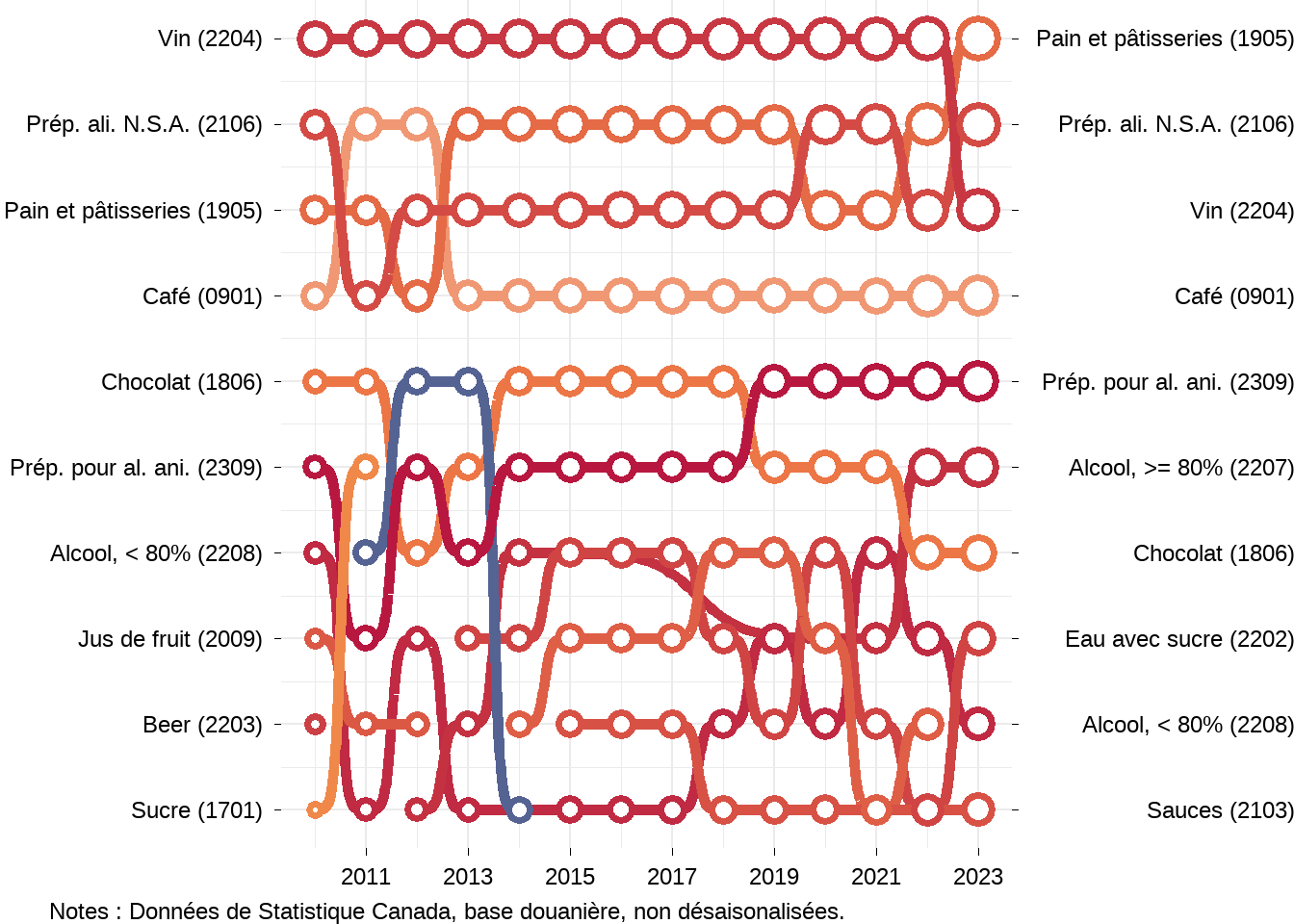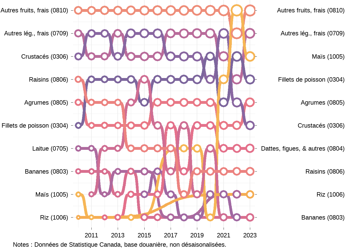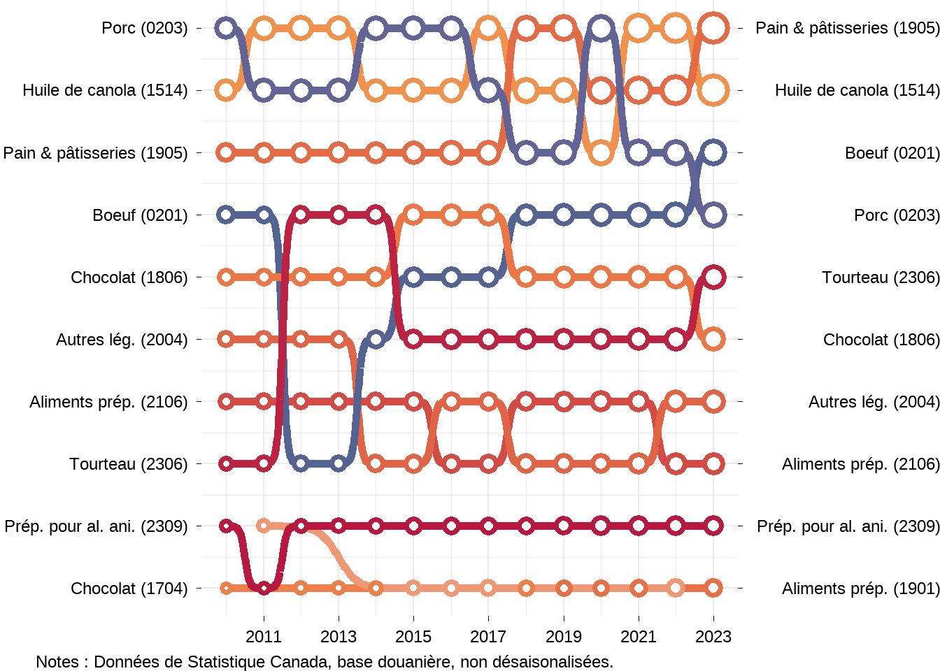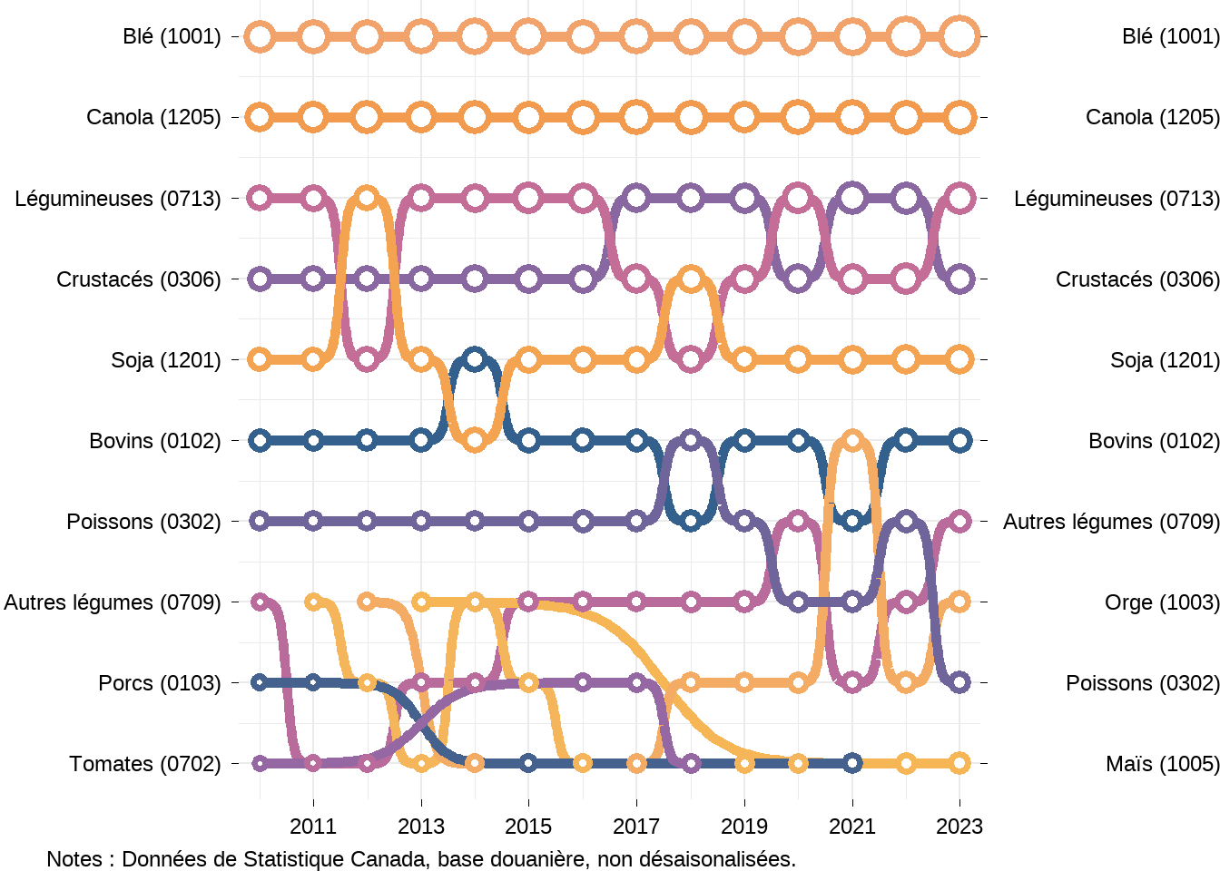 Examinons maintenant qui sont les principaux partenaires commerciaux du Canada dans le secteur agroalimentaire. J’utiliserai des graphiques de bosses (bump chart en anglais) pour montrer les dix principaux partenaires commerciaux du Canada au fils du temps. En haut des graphiques on retrouve le premier partenaire commercial du Canada et au bas le dixième partenaire commercial du Canada. Les graphiques ne montrent pas les valeurs commerciales, mais la taille des cercles montre l’importance relative des relations commerciales, un cercle plus grand indiquant une valeur plus élevée.