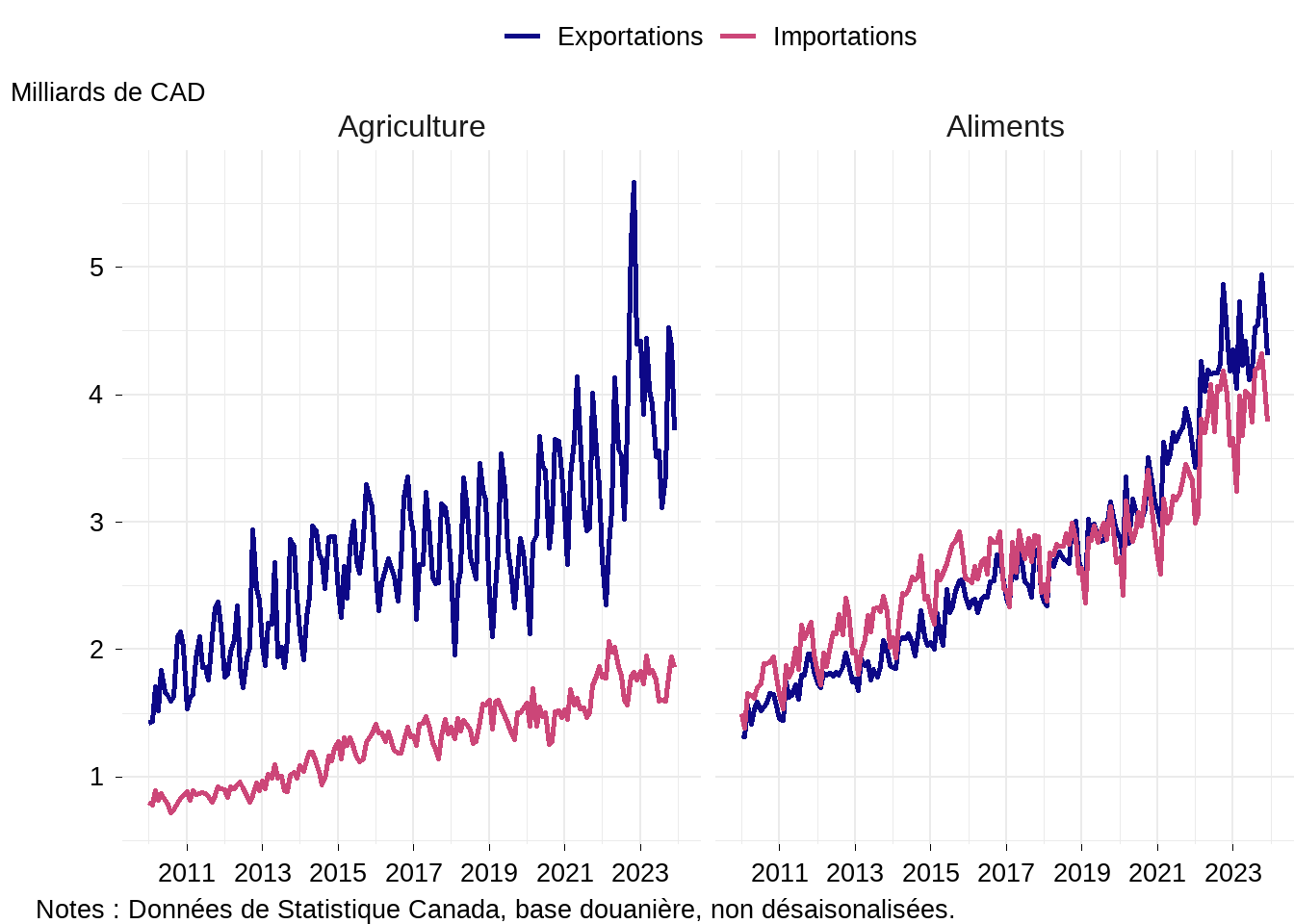 La Figure 2 montre le commerce mensuel de produits agroalimentaires du Canada entre 2010 et 2023. Les exportations et importations agricoles et alimentaires sont saisonnières et ont suivi des tendances haussières. Les exportations de produits agricoles dépassent largement les importations. En 2023, le Canada a exporté pour 3,9 milliards de dollars canadiens et importé 1,8 milliard de dollars canadiens par mois de produits agricoles. L’excédent commercial agricole s’est établi à 25,6 milliards de dollars canadiens en 2023.