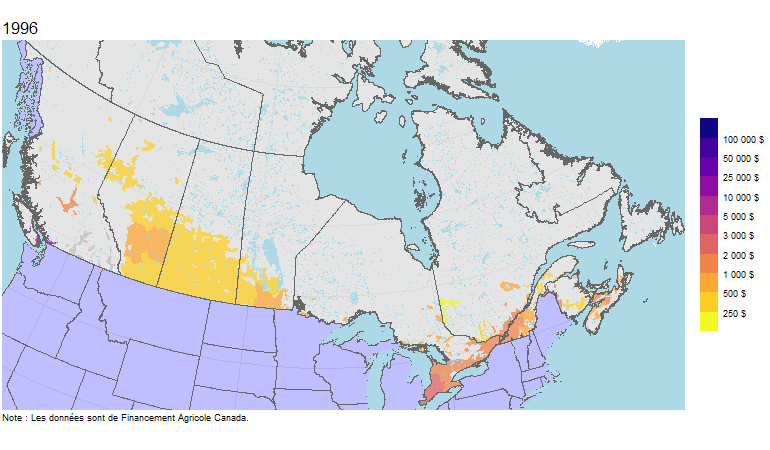 Remarquez les grands étendus de terres agricoles dans les provinces des Prairies par rapport au reste du Canada. Les terres agricoles des Prairies ont tendance à être plus abordables que les terres agricoles de l’Ontario, du Québec et de la Colombie-Britannique. Notez aussi qu’il y a une différence nette entre la valeur des terres en Alberta et en Saskatchewan.