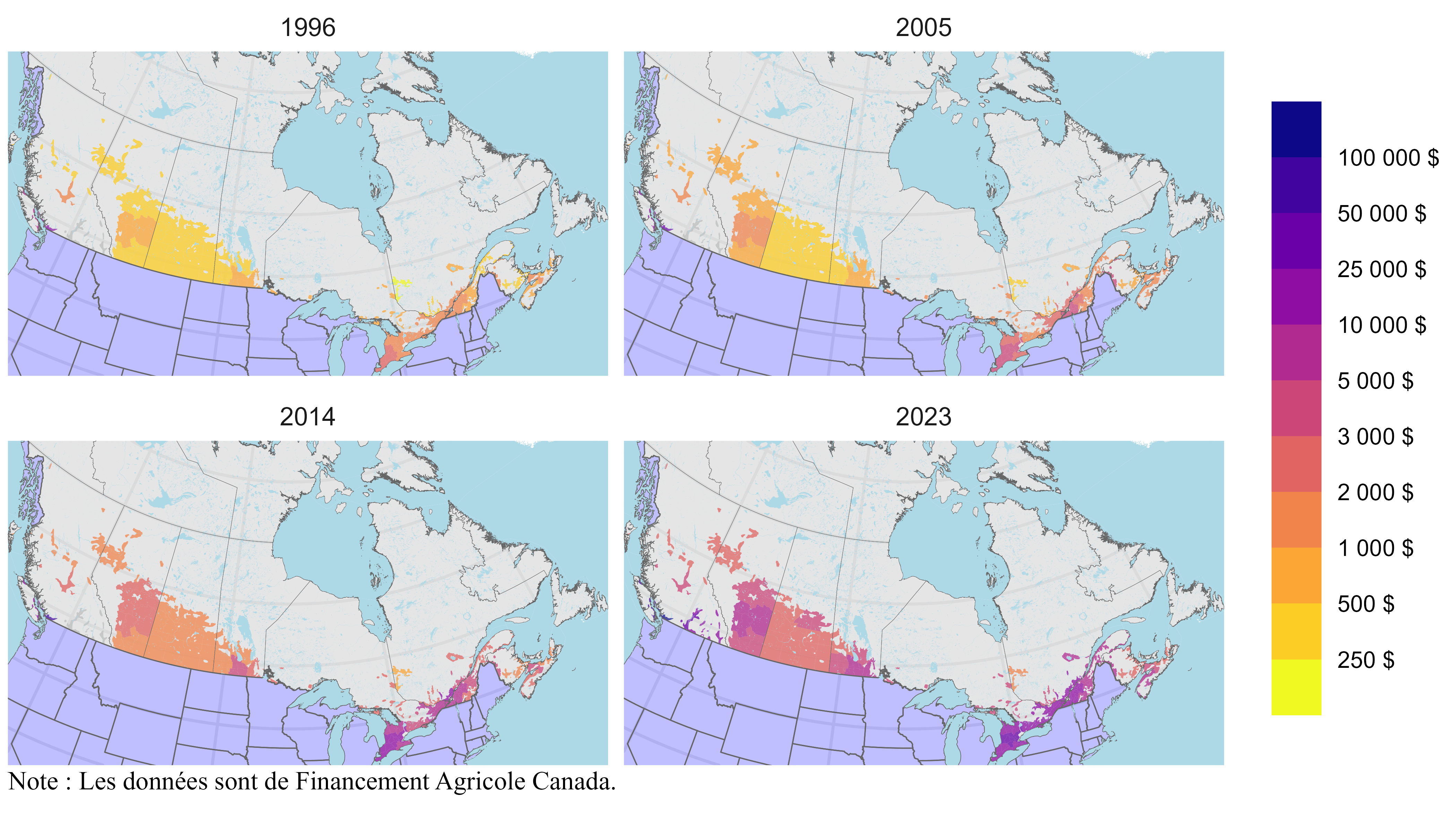 La Figure 2 montre les cartes de la valeur des terres agricoles pour 1996, 2005, 2014 et 2023. Au fur et à mesure que la valeur des terres agricoles augmente, la carte s’assombrit. Cela est vrai pour toutes les régions, car la valeur des terres agricoles a augmenté partout. Il y a cohérence dans le temps, les terres les plus chères en 1996 le sont également en 2023. Les terres les plus dispendieuses se trouvent dans la région de Côte-Sud, près de Vancouver, en Colombie-Britannique. Les terres agricoles de cette région ne couvrent qu’une petite surface et sont à peine visibles sur les cartes. Ailleurs, les terres les plus chères se trouvent le long du fleuve Saint-Laurent, près du lac Érié et du lac Ontario, où se trouve la majeure partie de la population canadienne.