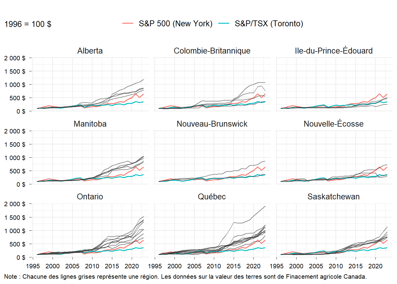 La figure ci-dessous montre comment 100 $ investis dans des terres agricoles ou sur les marché boursiers auraient augmenté au fil du temps. Chaque ligne grise montre le rendement d’un investissement dans des terres agricoles pour une région. L’indice composé S&P/TSX est en bleu et l’indice S&P 500 est en rouge. L’indice composé S&P/TSX est une mesure du rendement attendu d’un placement dans des actions canadiennes à Toronto, tandis que l’indice S&P 500 est une mesure du rendement attendu d’un placement dans des actions américaines (New York).1 L’indice S&P/TSX (Toronto) ne place pas la barre très haute en matière de rendement, affichant en moyenne un rendement annuel de 4,8 %. Le rendement annuel moyen de l’indice S&P 500 (New York) est de 7,1 %.